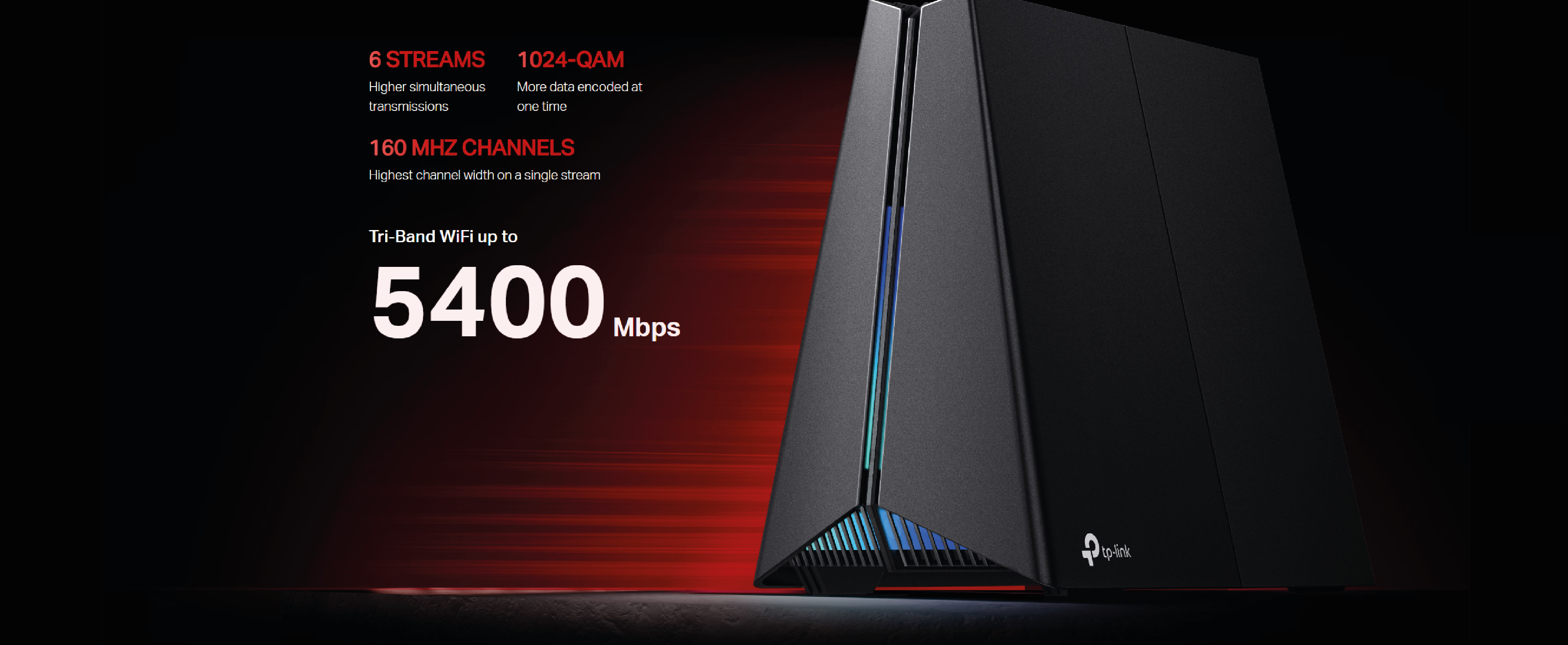 TP-Link Archer GXE75 to trójpasmowy router bezprzewodowy obsługujący standard Wi-Fi 6E (802.11ax). Może transmitować sieć jednocześnie w pasmach 2,4 GHz, 5 GHz oraz 6 GHz, wykorzystując protokoły IEEE 802.11 b/g/n/ax w paśmie 2,4 GHz, IEEE 802.11 a/n/ac/ax w paśmie 5 GHz oraz IEEE 802.11 ax w paśmie 6 GHz. Maksymalna teoretyczna przepustowość wynosi 574 Mb/s w paśmie 2,4 GHz, 2402 Mb/s w paśmie 5 GHz oraz 2402 Mb/s w paśmie 6 GHz, co łącznie daje klasę AXE5400. Router został wyposażony w gigabitowe porty Ethernet (1× WAN oraz 4× LAN), umożliwiające budowę stabilnej i szybkiej sieci przewodowej. Dzięki technologiom charakterystycznym dla Wi-Fi 6/6E, takim jak OFDMA, MU-MIMO, Beamforming czy obsługa szerokich kanałów 160 MHz w paśmie 6 GHz, urządzenie oferuje wyższą wydajność, niższe opóźnienia i stabilniejsze połączenia. To szczególnie istotne w grach online, transmisjach na żywo oraz aplikacjach wymagających niskiej latencji. Archer GXE75 został zaprojektowany z myślą o graczach i wymagających użytkownikach. Router zapewnia pełne wsparcie dla środowisk z wieloma jednoczesnymi połączeniami, sprawdzając się zarówno w zastosowaniach domowych, jak i półprofesjonalnych, gdzie niezbędna jest maksymalna wydajność sieci przewodowej i bezprzewodowej.