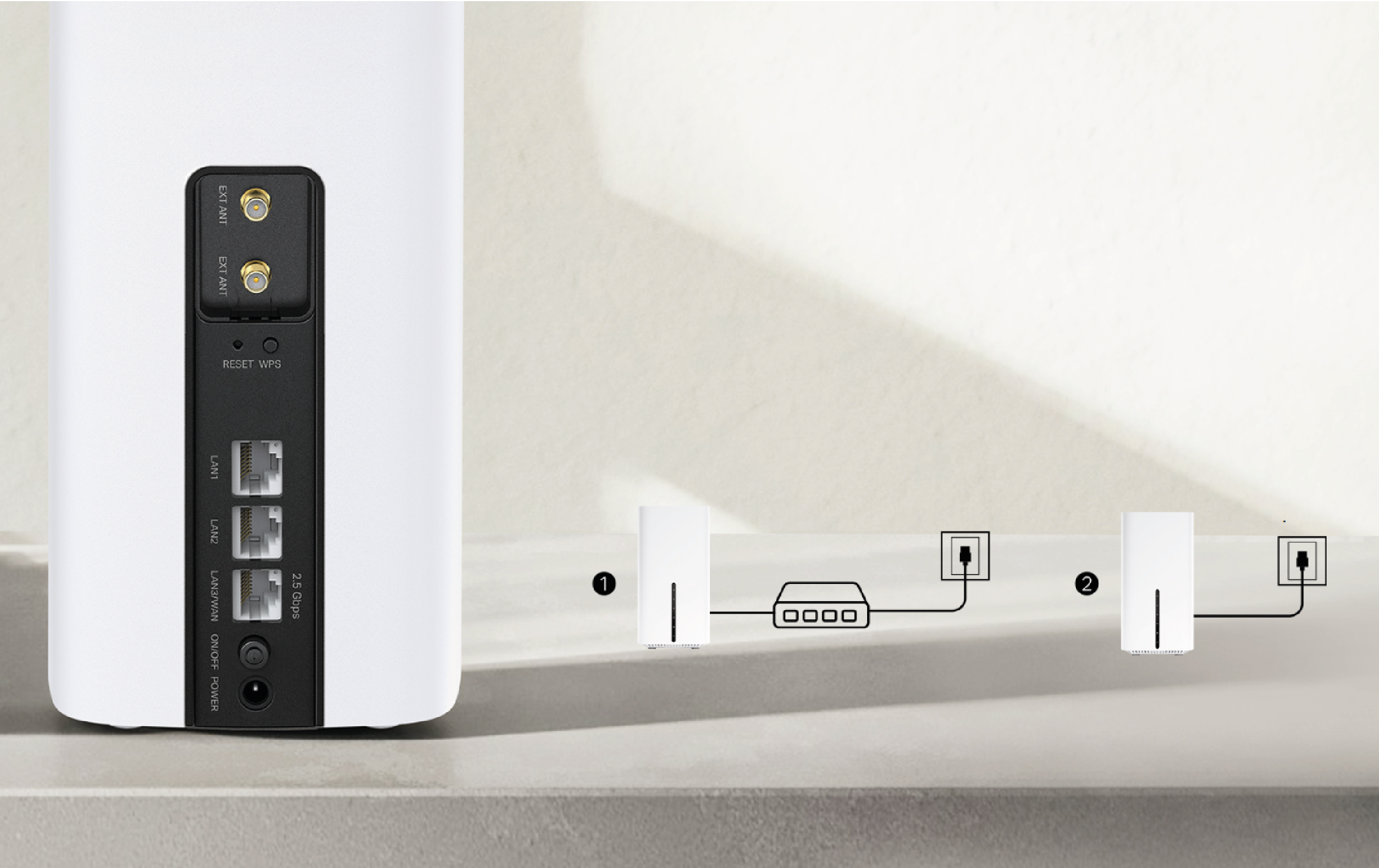 Dzięki w pełni funkcjonalnemu portowi WAN/LAN o prędkości 2,5 Gb/s i dwóch gigabitowych portów LAN, Archer NX600 może pracować jako zwykły router bezprzewodowy, który jest zgodny z modemami kablowymi, światłowodowymi i DSL. Gdy urządzenie zostanie ustawione jako router bezprzewodowy, wtedy połączenie 5G/LTE będzie działać jako łącze zapasowe, aby zapewnić ciągłe i stabilne połaczenie internetowe dla Ciebie. Dodatkowo, dwa porty anten umożliwiają podłączenie zewnętrznej anteny, dzięki czemu możliwe będzie efektywniejsze odbieranie sygnału sieci 5G/4G i tym samym zwiększenie wydajności połączenia.