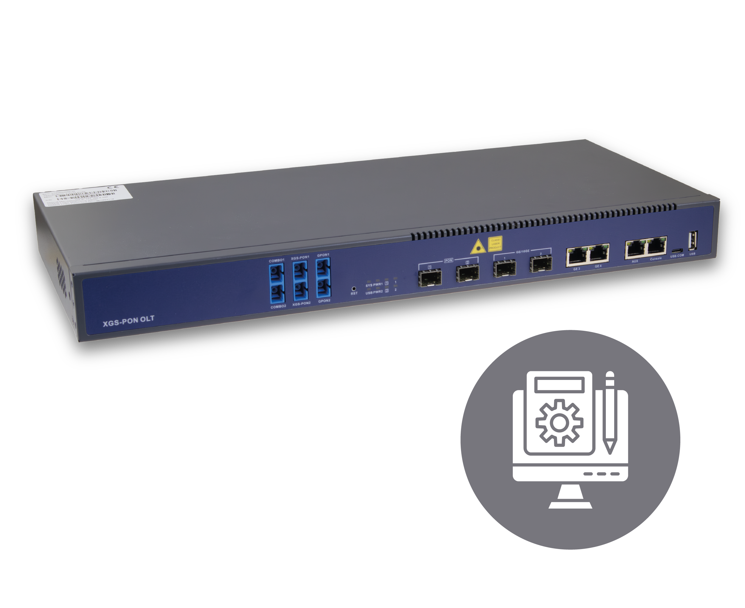 Oferowany produkt to terminal OLT (nadawczy) wyposażony w dwa porty PON typu Combo. Prowadzona jest na nich jednocześnie transmisja XG-PON oraz XGS-PON. Dzięki temu podłączając abonentów możesz skorzystać z terminala ONT w jednej z dwóch technologii, zależnie od pakietu, jaki mu oferujesz. XG-PON umożliwia uzyskanie przepustowości 10 / 2,5 Gb/s (do / od klienta), a XGS-PON symetrycznie 10 / 10 Gb/s. Split wynosi 1:256, ale producent sugeruje korzystanie maksymalnie z 1:128. W zestawie znajdziesz odpowiednie wkładki PON.