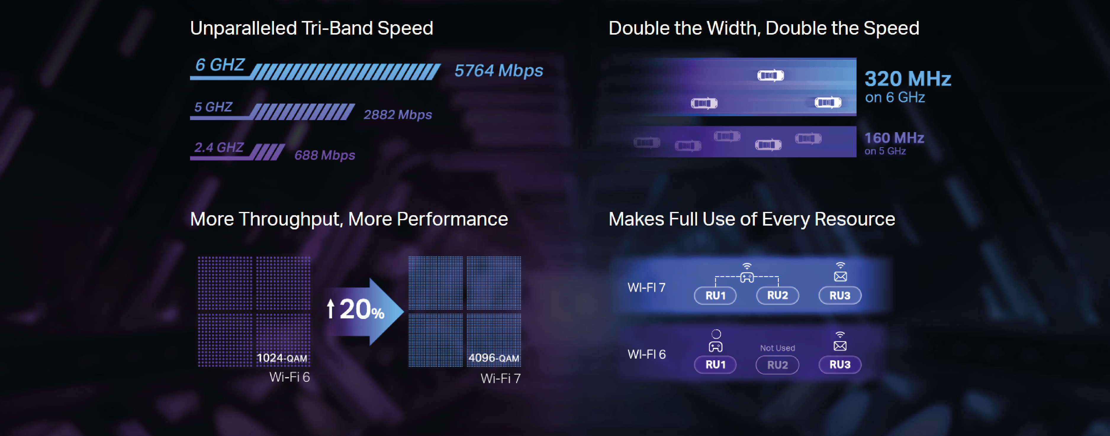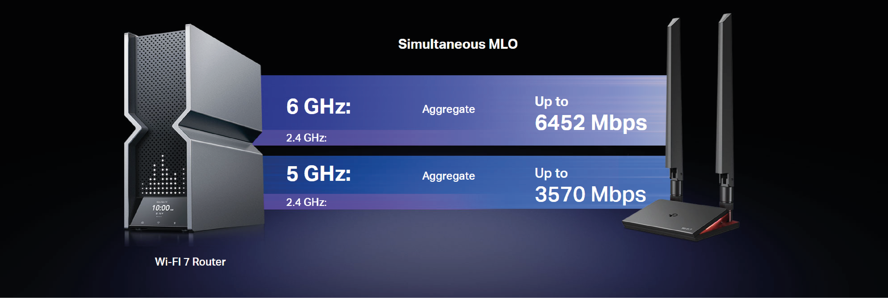 Technologia Multi-Link Operation (MLO) umożliwia Archer TBE550E łączenie pasma 2,4 GHz z pasmem 5 GHz lub 6 GHz, osiągając prędkości do 6452 Mb/s. Zapewnia to płynne i wydajne działanie sieci, wyższą przepustowość, niższe opóźnienia oraz większą niezawodność.