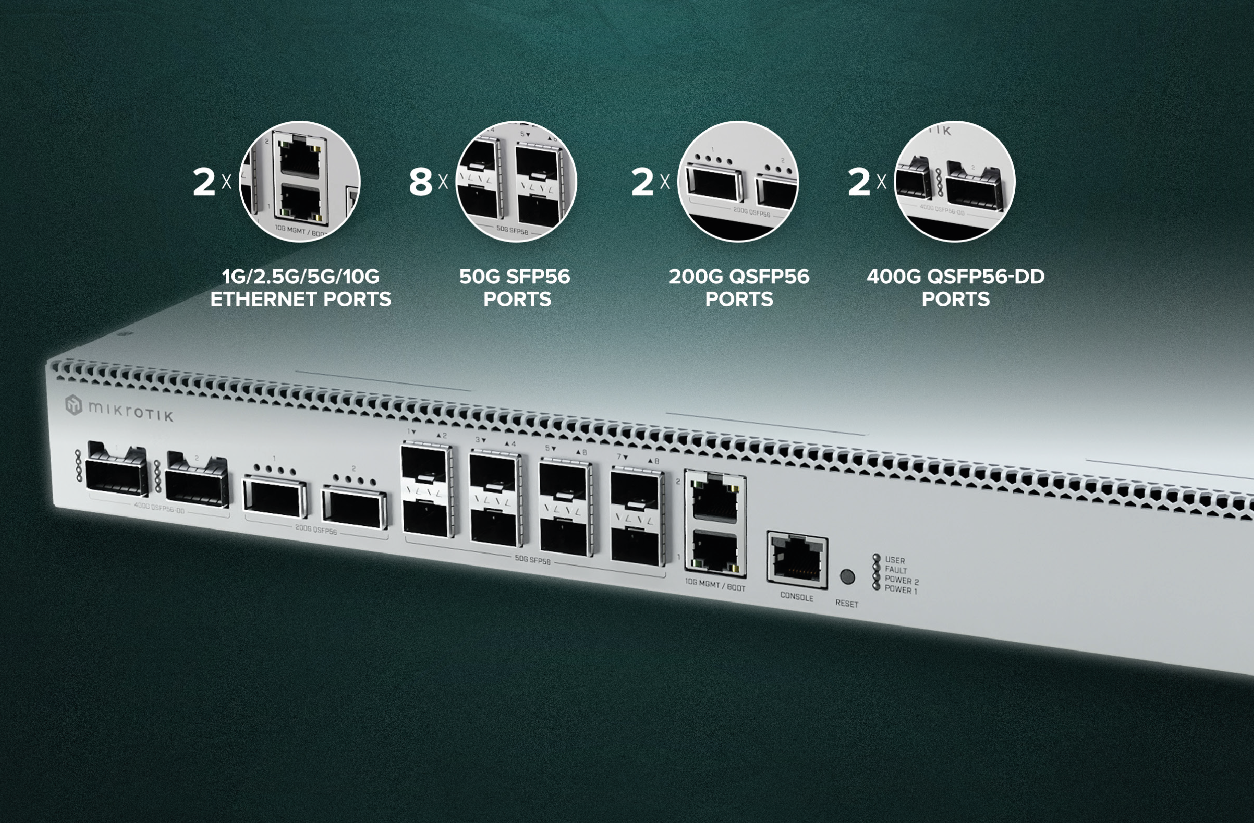 Switch posiada 2 sloty QSFP-DD o przepustowości do 400 Gb/s, 2 sloty QSFP56 o przepustowości 200 Gb/s oraz 8 slotów SFP56 o przepustowości 50 Gb/s. Możliwość stworzenia połączeń o tak dużej prędkości sprawia, że CRS812 DDQ to bardzo elastyczne urządzenie, które sprawdzi się w licznych zastosowaniach. Każdy z interfejsów obsługuje automatyczną negocjację prędkości połączeń, porty QSFP-DD / QSFP56 do 40 Gb/s, porty 10G Ethernet / SFP56 do 1 Gb/s. Dzięki kompatybilności wstecz oferowany produkt doskonale sprawdzi się podczas modernizacji sieci / serwerowni, umożliwia podłączenie starszych urządzeń bez obaw o kompatybilność.