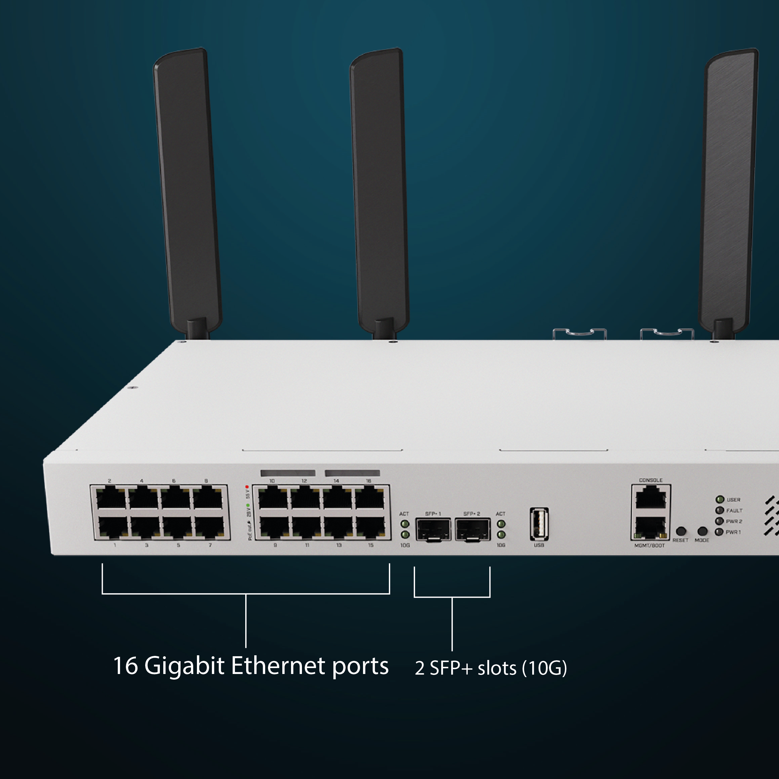 CRS został wyposażony w 16 gigabitowych portów Ethernet (10/100/1000 Mb/s) oraz 2 sloty SFP+ (10 Gb/s). Tak duża liczba interfejsów Ethernet umożliwi w wielu zastosowaniach rezygnację ze stosowania dodatkowego switcha. Sloty SFP+ o dużej przepustowości doskonale sprawdzą się jako port WAN, zwłaszcza jeżeli korzystasz z pakietu danych powyżej 1 Gb/s. Drugi slot możesz wykorzystać do podłączenia urządzenia wymagającego dużej prędkości, np. serwera NAS.
