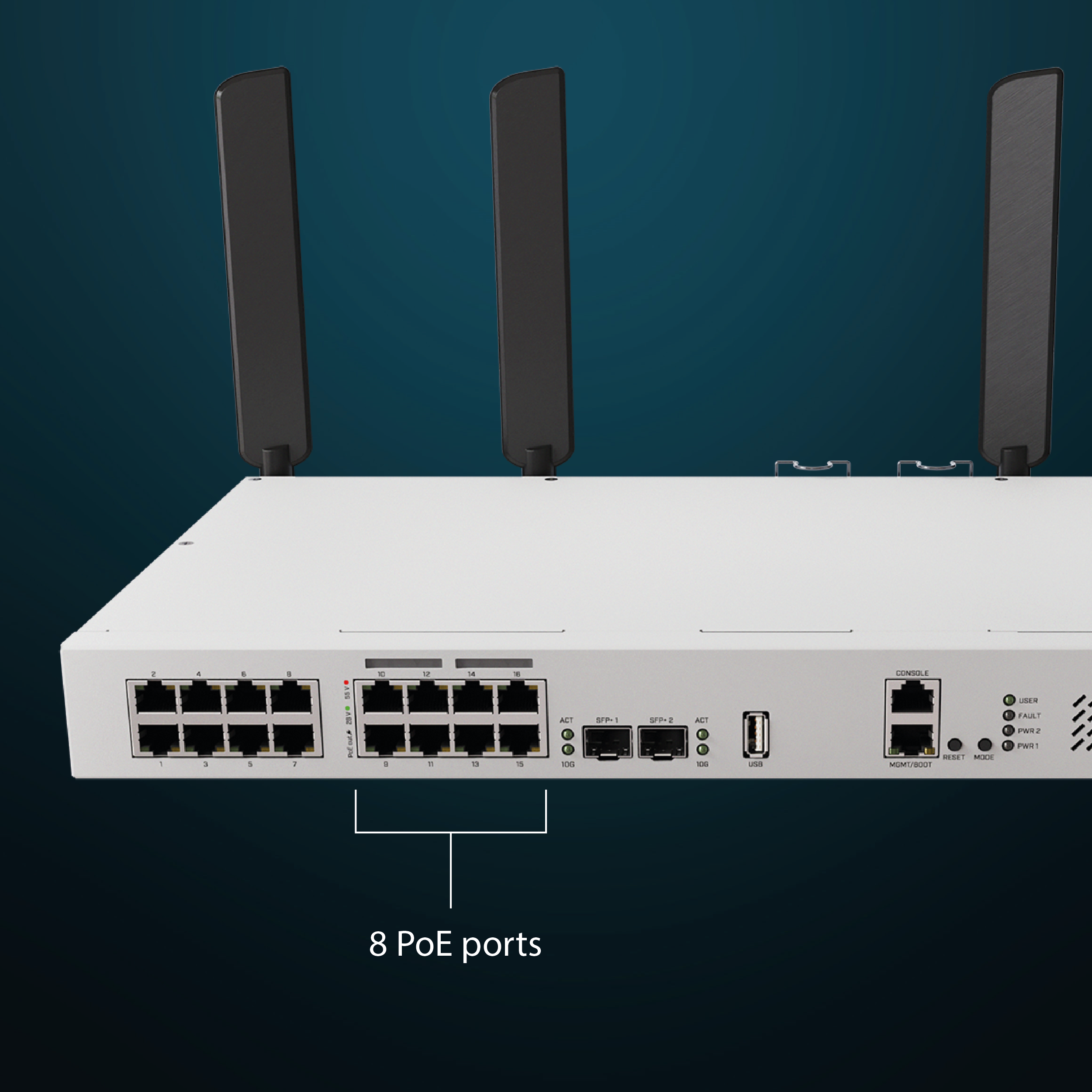 Na portach Ethernet 9 - 16 znajdują się dodatkowo porty PoE, możesz skorzystać z pasywnego PoE 24 V lub PoE+ (802.3af/at). Maksymalny, łączny budżet mocy wyjściowej wynosi 150 W. Jest to moc wystarczająca do podłączenia 8 kamer IP, a nawet 8 punktów dostępowych, o ile nie mają zbyt dużego poboru mocy. Tym samym CRS w wielu sieciach może zlikwidować konieczność montażu switcha dostępowego.