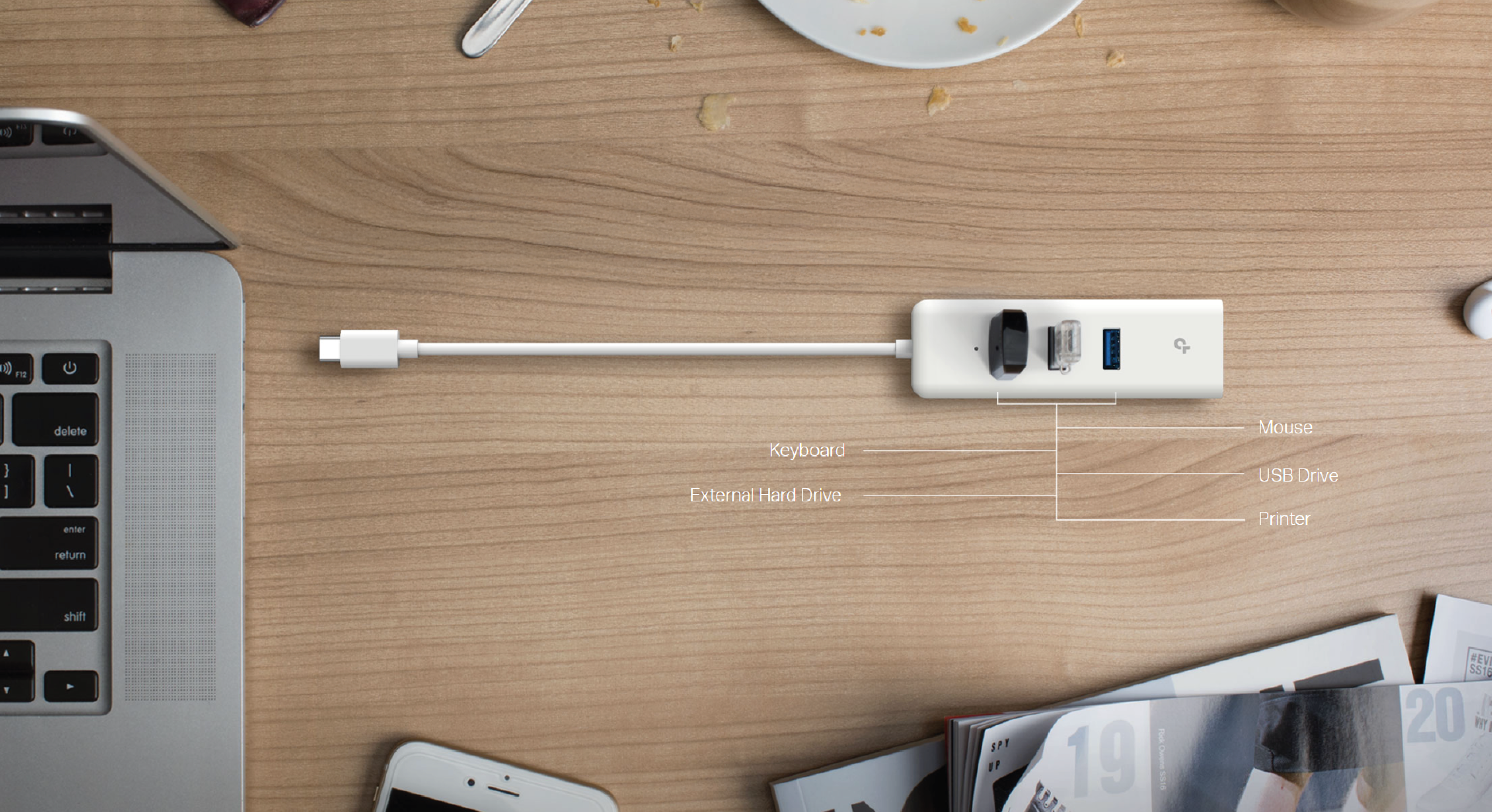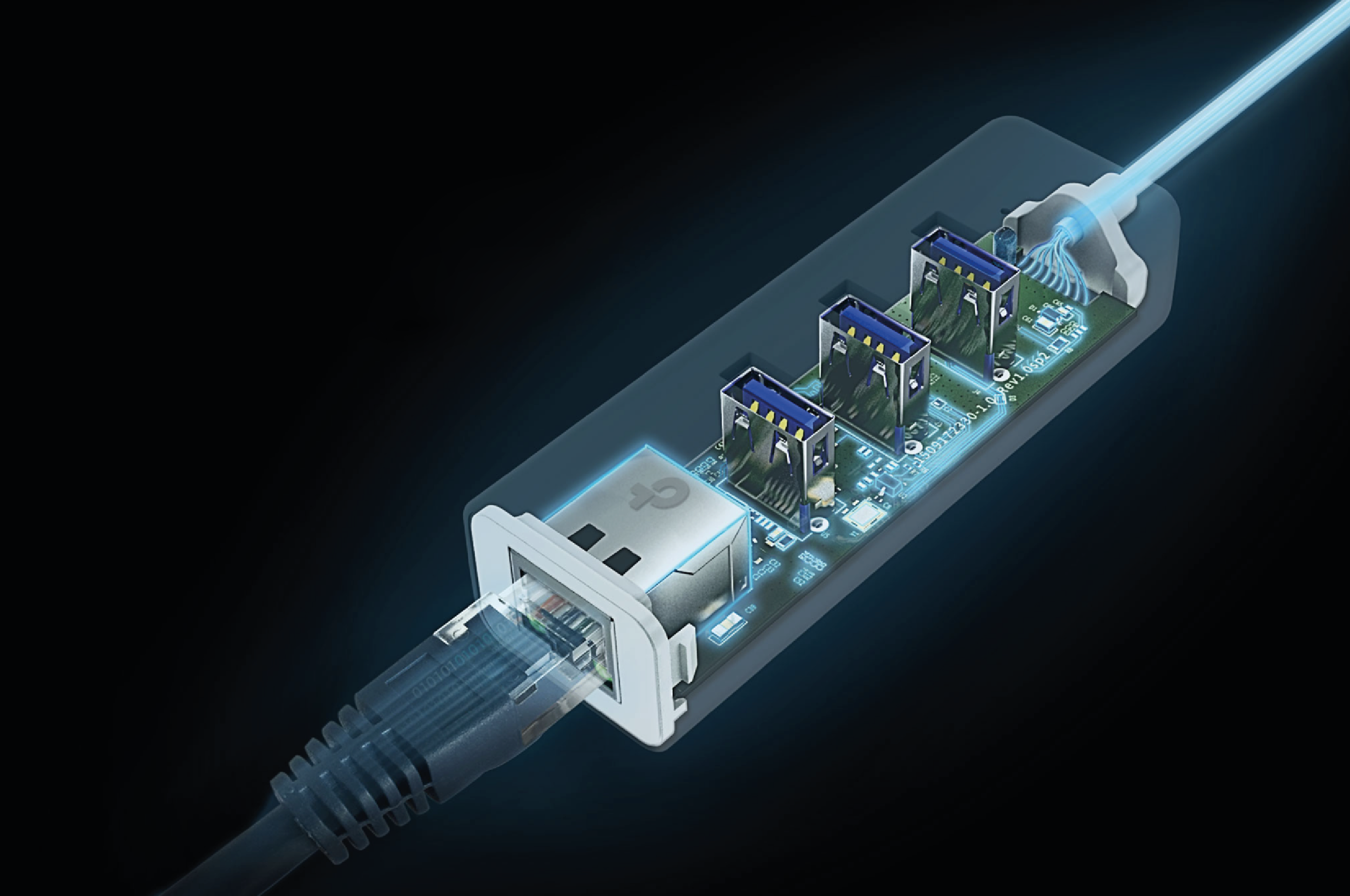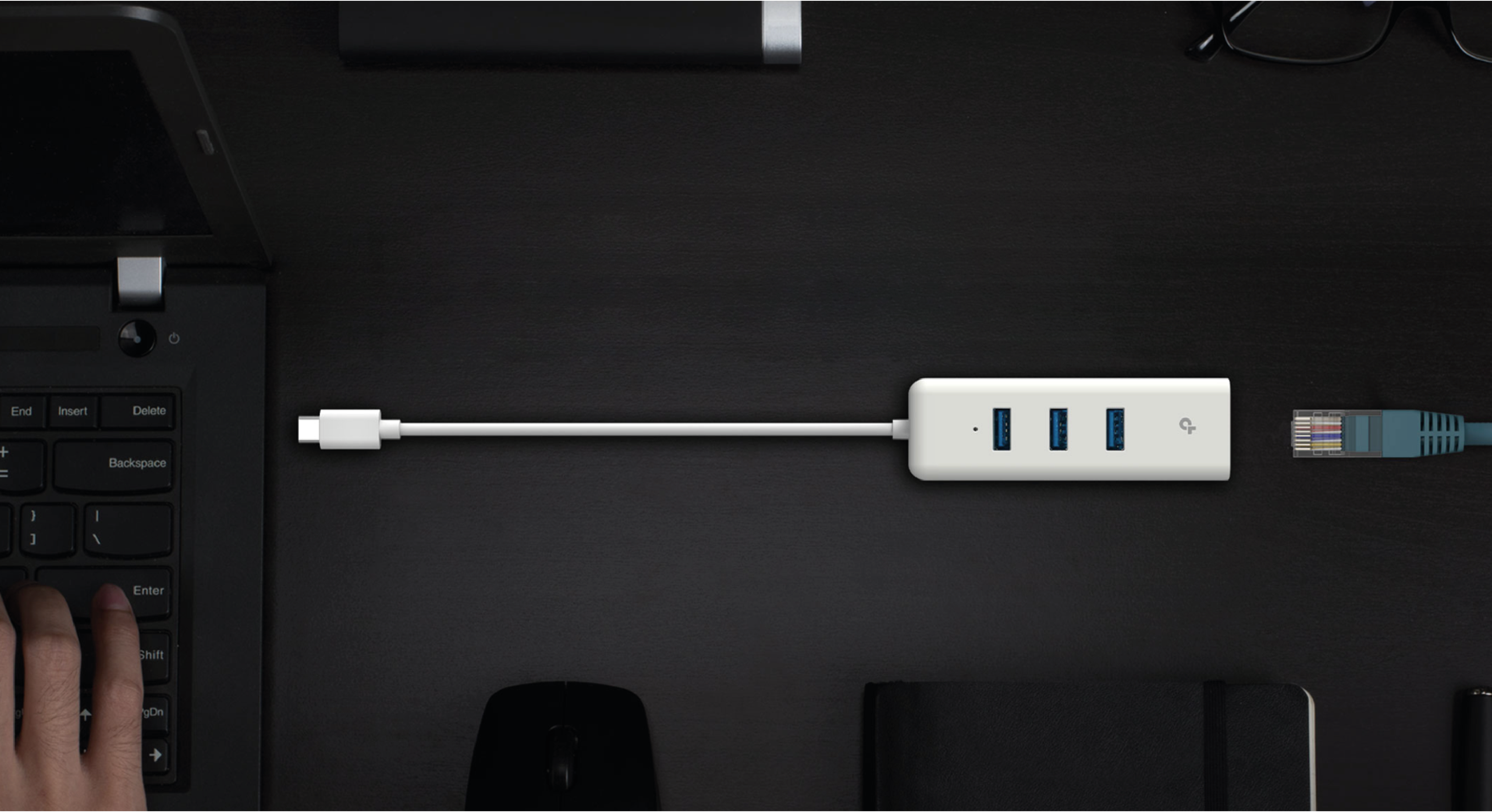 TP-Link UE330C to gigabitowy adapter sieciowy USB typu C, który łączy w sobie funkcję karty sieciowej Ethernet z 3-portowym hubem USB 3.0. Urządzenie umożliwia szybkie i stabilne połączenie przewodowe z prędkością do 1000 Mb/s, zapewniając niezawodny dostęp do internetu w komputerach i laptopach pozbawionych wbudowanego portu Ethernet.
