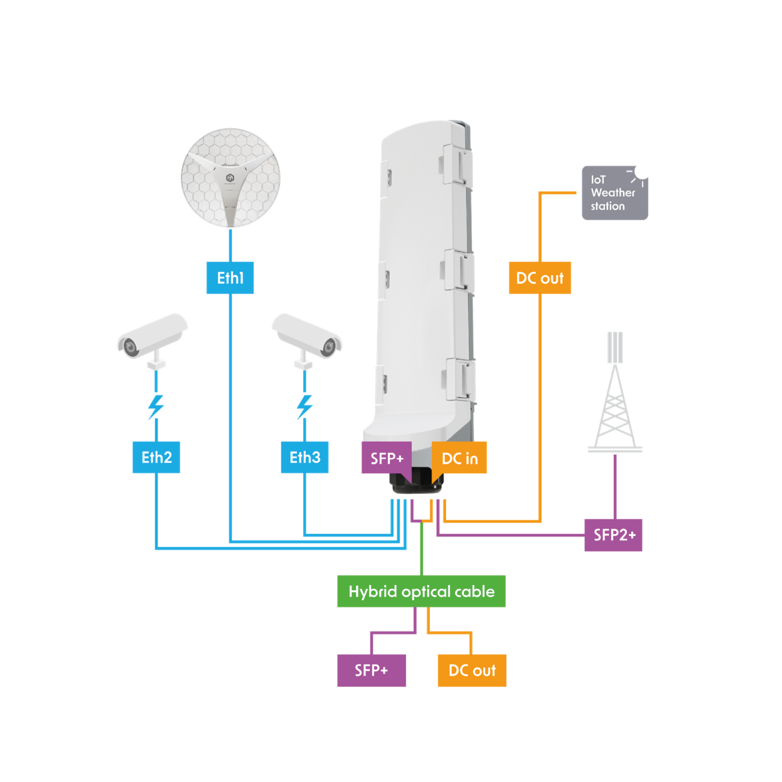 Oferowany produkt został zaprojektowany z myślą o wykorzystaniu jako switch do montażu bezpośrednio na słupie, do podłączania i jednoczesnego zasilania innych urządzeń. Z uwagi na zastosowanie różnego rodzaju interfejsów (światłowodowe i Ethernet) oraz wyjść zasilania PoE i DC zapewnia bardzo dużą elastyczność. Sprawdzi się zarówno przy współpracy z typowymi urządzeniami sieciowymi np. stacjami bazowymi, kamerami IP czy punktami dostępowymi, jak również przy podłączeniu rozwiązań IoT, np. różnego rodzaju czujników. Dodatkowo sloty SFP+ dzięki dużej przepustowości ułatwią łączenie dwóch różnych lokalizacji od słupa do słupa, bez obawy o zasięg.