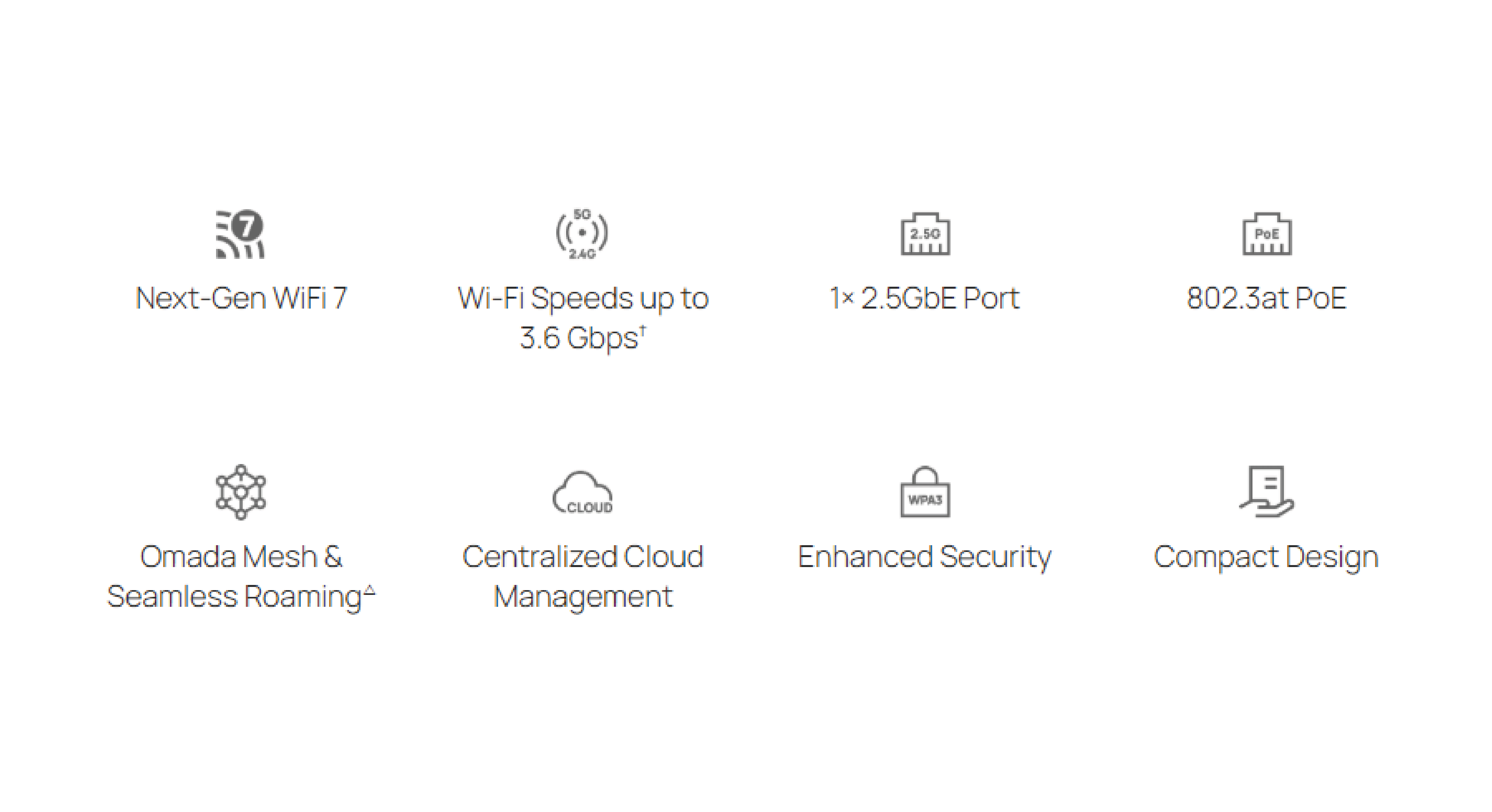 EAP723 posiada kompaktową obudowę o średnicy 160 mm i wysokości 33,6 mm, dzięki czemu idealnie nadaje się do montażu sufitowego i dyskretnej integracji z otoczeniem. Urządzenie może pracować jako samodzielny punkt dostępowy lub w ramach większej infrastruktury sieciowej zarządzanej centralnie przez system Omada SDN, wspierając inteligentne funkcje, takie jak automatyczne równoważenie obciążenia, bezproblemowy roaming i centralne zarządzanie w chmurze.