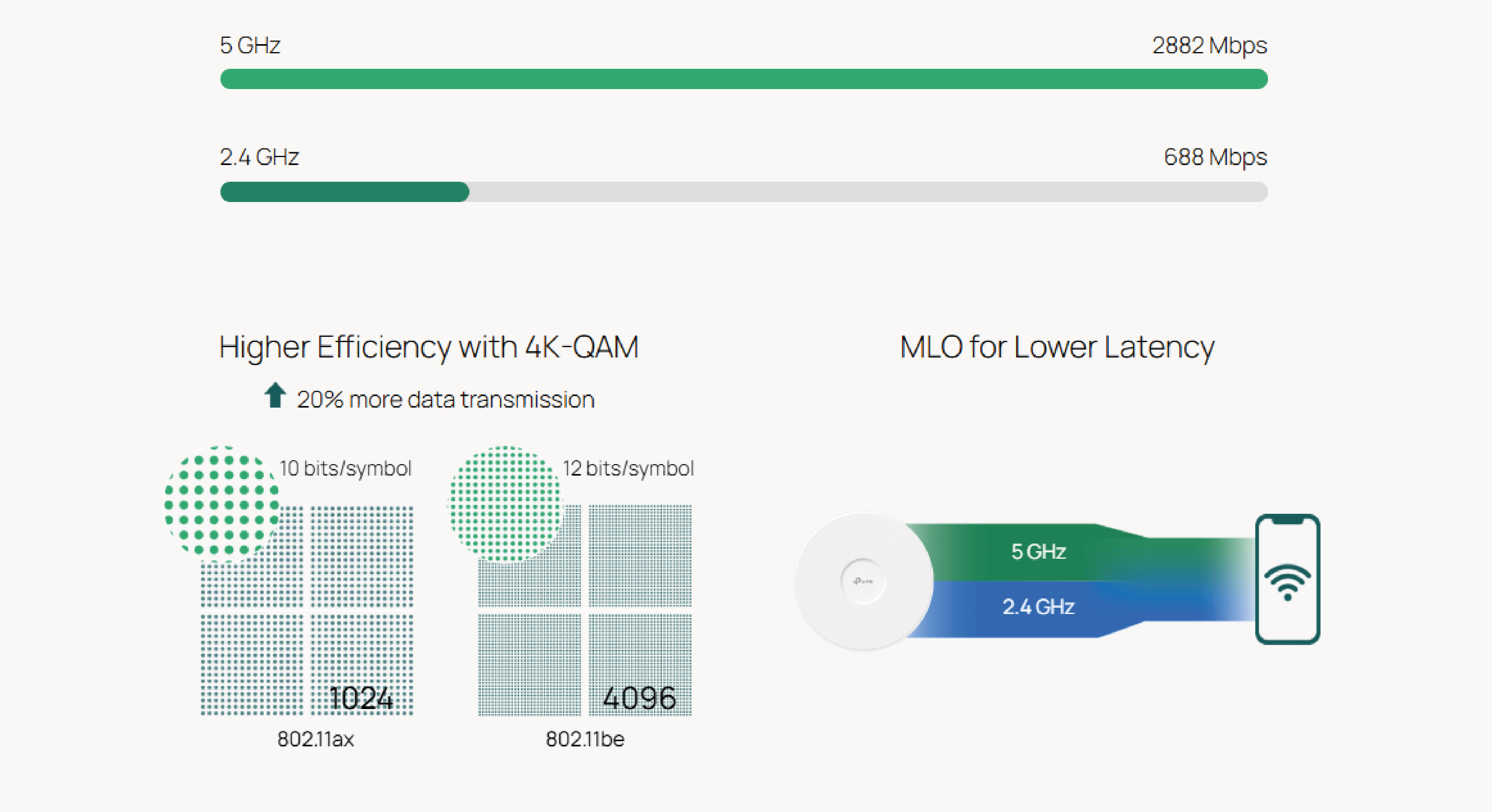 TP-Link EAP723 to sufitowy punkt dostępowy obsługujący najnowszy standard Wi-Fi 7 (IEEE 802.11be), pracujący jednocześnie w pasmach 2,4 i 5 GHz. Maksymalna łączna przepustowość transmisji wynosi 3600 Mb/s – do 688 Mb/s w paśmie 2,4 GHz oraz 2882 Mb/s w 5 GHz. Urządzenie wykorzystuje kluczowe technologie Wi-Fi 7, takie jak 320 MHz kanały, 4K-QAM, OFDMA oraz Multi-Link Operation (MLO), które zapewniają wyjątkową przepustowość, niskie opóźnienia i wysoką wydajność w środowiskach o dużej liczbie użytkowników. Zastosowane mechanizmy MU-MIMO oraz Beamforming zwiększają efektywność transmisji i zasięg, a najnowsze zabezpieczenia WPA3 gwarantują wysoki poziom ochrony danych.