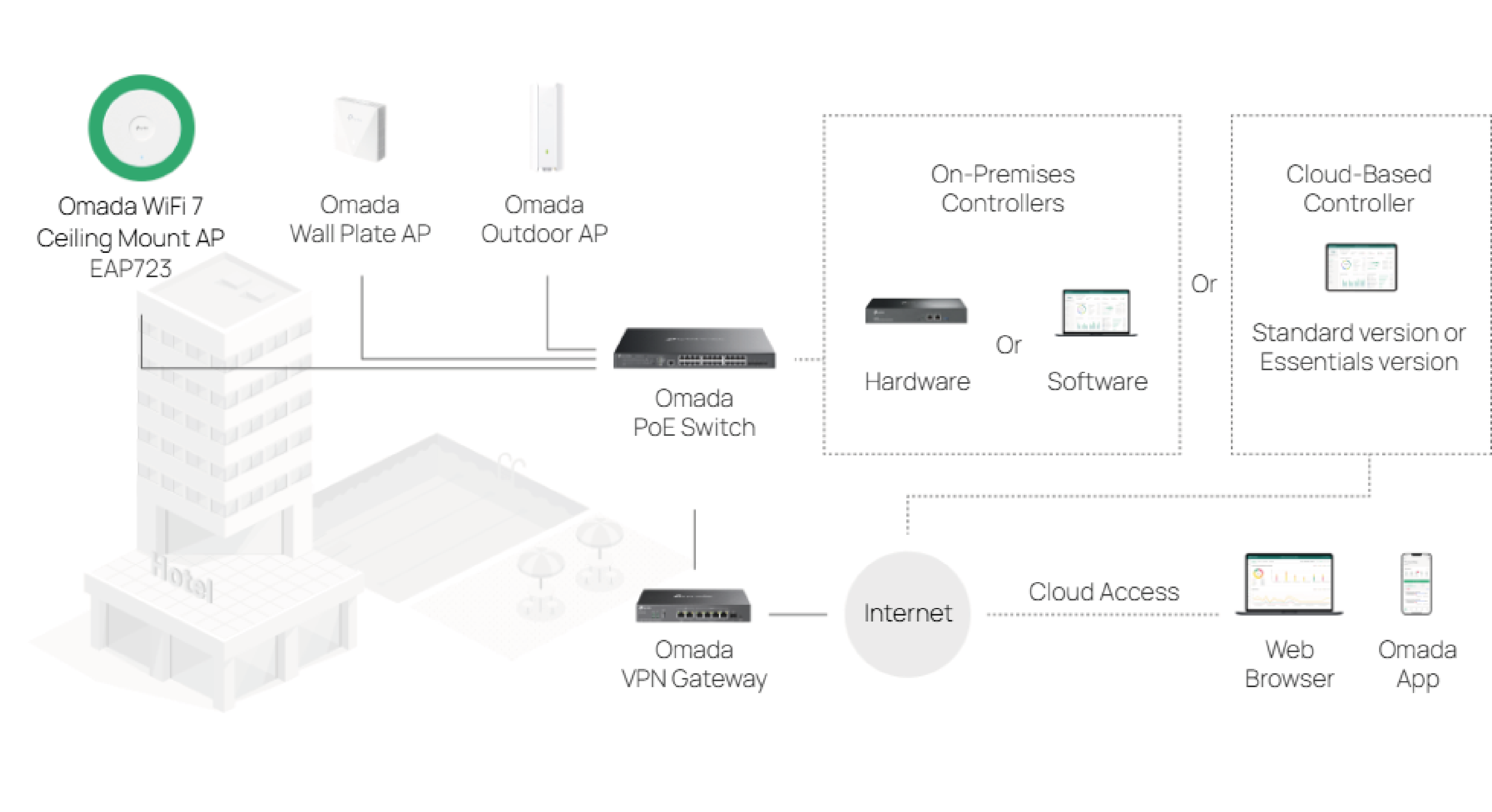 | Scentralizowane zarządzanie | Kontroler Omada oparty na Chmurze Kontroler sprzętowy Omada Kontroler programowy Omada |
