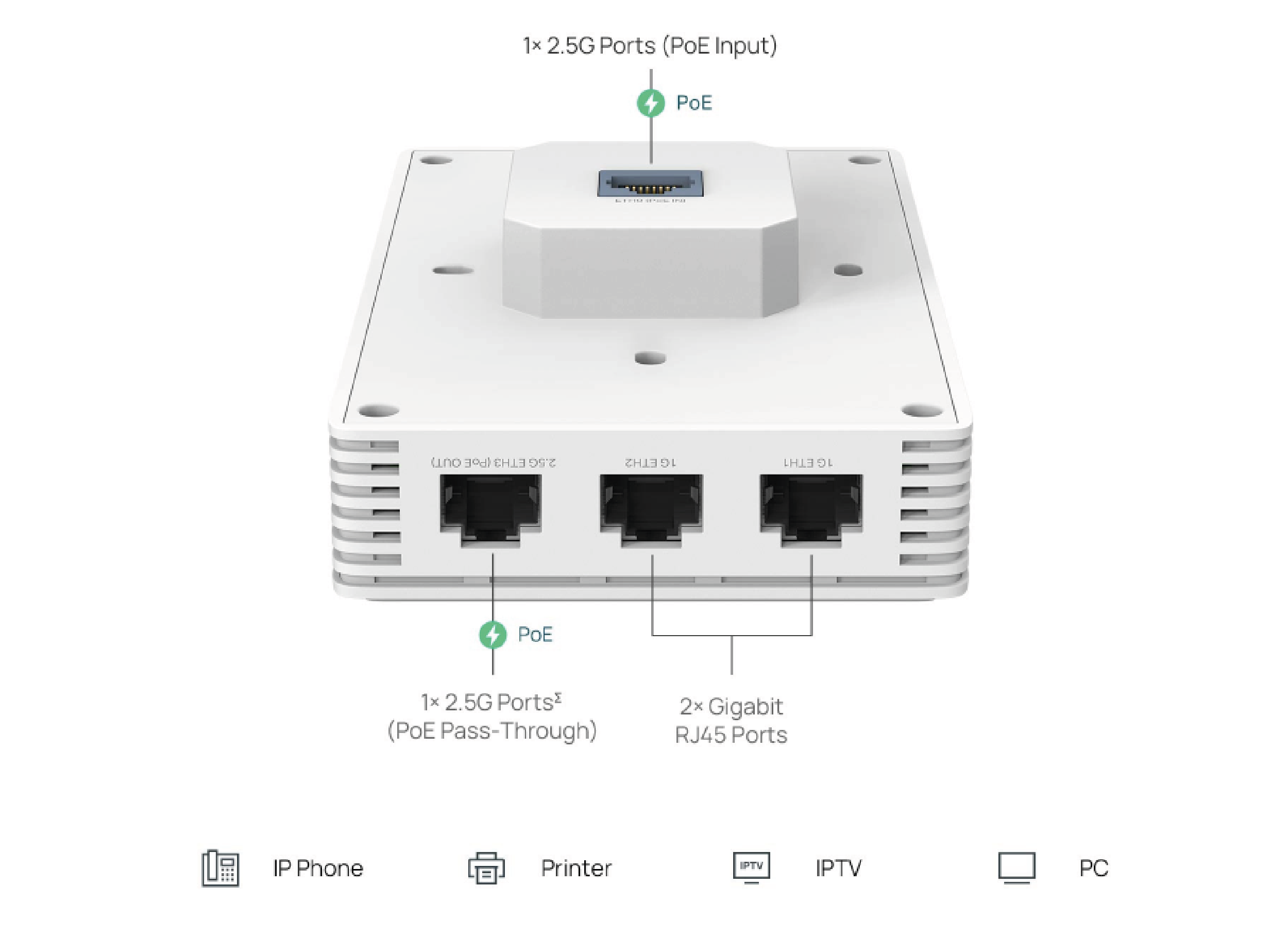 • Uplink: • Downlink: (Port 2,5G obsługuje PoE Pass-Through. Funkcja PoE Pass-Through wymaga użycia zasilania PoE na wejściu 802.3at/bt. Jeśli zużycie energii urządzenia downstream Punktu dostępowego przekracza 7W, Punkt dostępowy będzie wymagał wtedy na wejściu zasilania PoE 802.3bt.) |