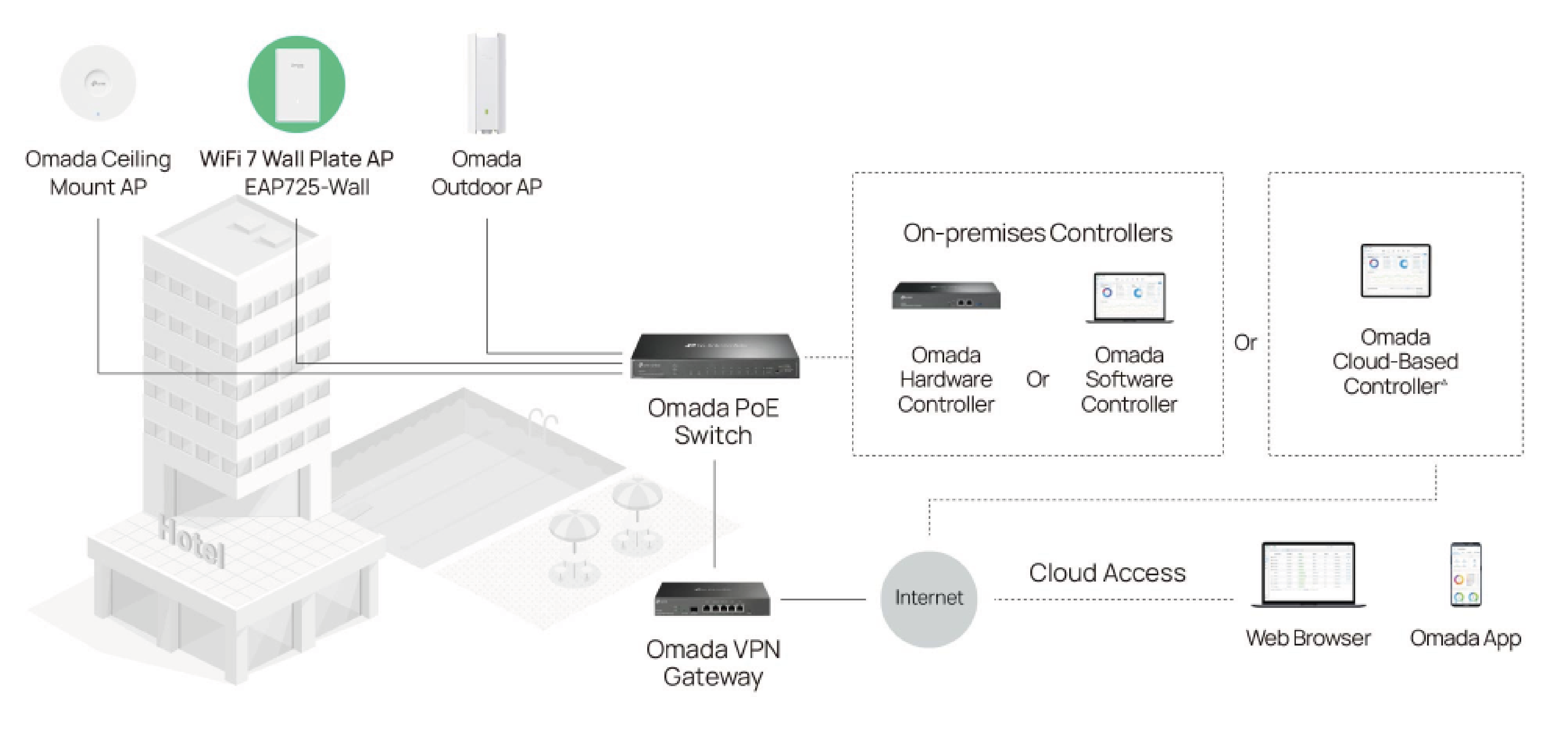 | Scentralizowane zarządzanie | Kontroler sprzętowy Omada (OC300) Kontroler sprzętowy Omada (OC200) Kontroler programowy Omada Kontroler Omada oparty na Chmurze |