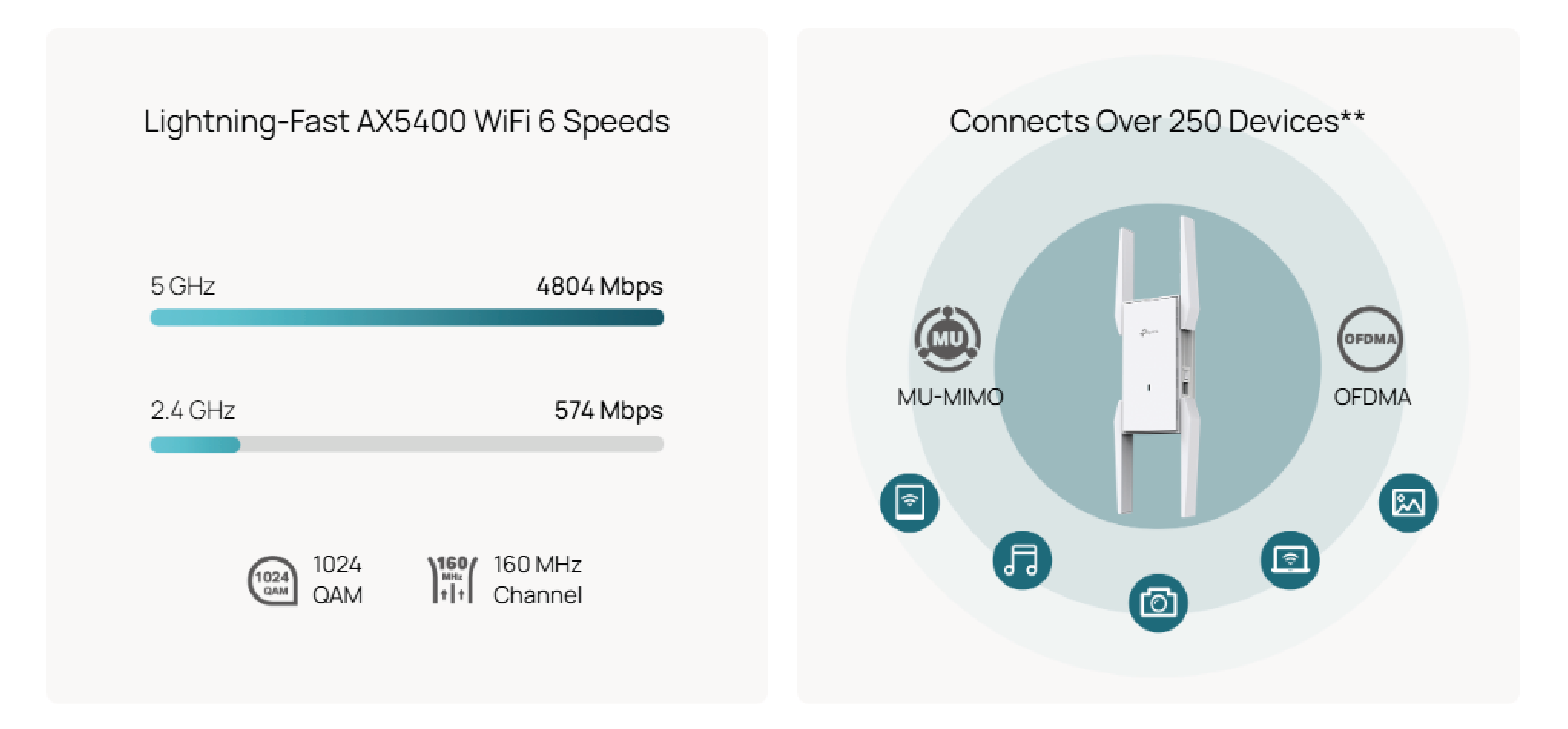 TP-Link EAP673-Extender to zaawansowany wzmacniacz sygnału obsługujący standard Wi-Fi 6 (IEEE 802.11ax), zapewniający ultraszybką łączność i stabilne działanie sieci Mesh. Urządzenie pracuje jednocześnie w pasmach 2,4 GHz i 5 GHz, oferując łączną przepustowość do 5400 Mb/s – do 574 Mb/s w paśmie 2,4 GHz oraz do 4804 Mb/s w paśmie 5 GHz. Dzięki technologiom Wi-Fi 6, takim jak OFDMA, 1024-QAM, MU-MIMO i Beamforming, EAP673-Extender gwarantuje wysoką wydajność, mniejsze opóźnienia oraz płynne działanie nawet przy dużej liczbie aktywnych użytkowników.