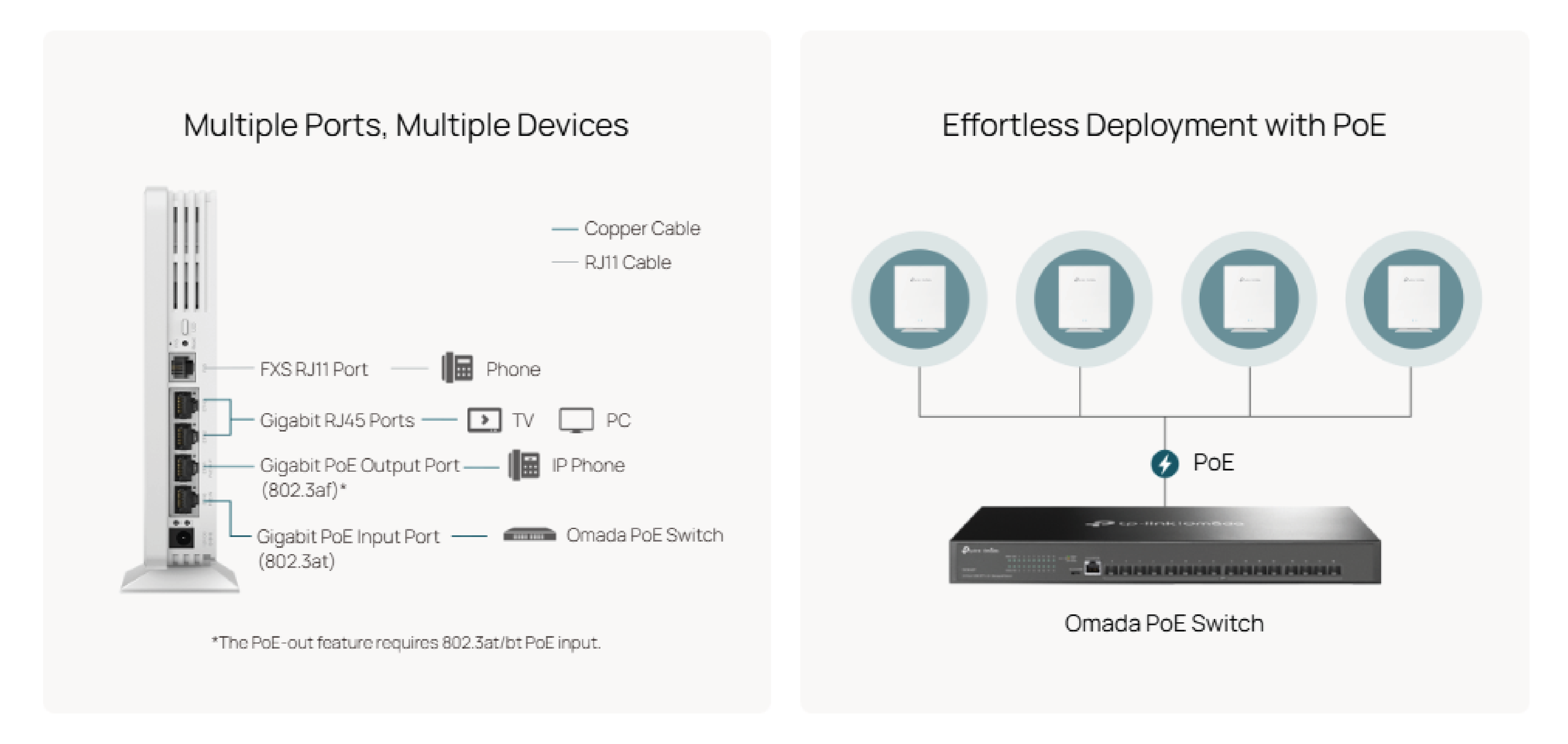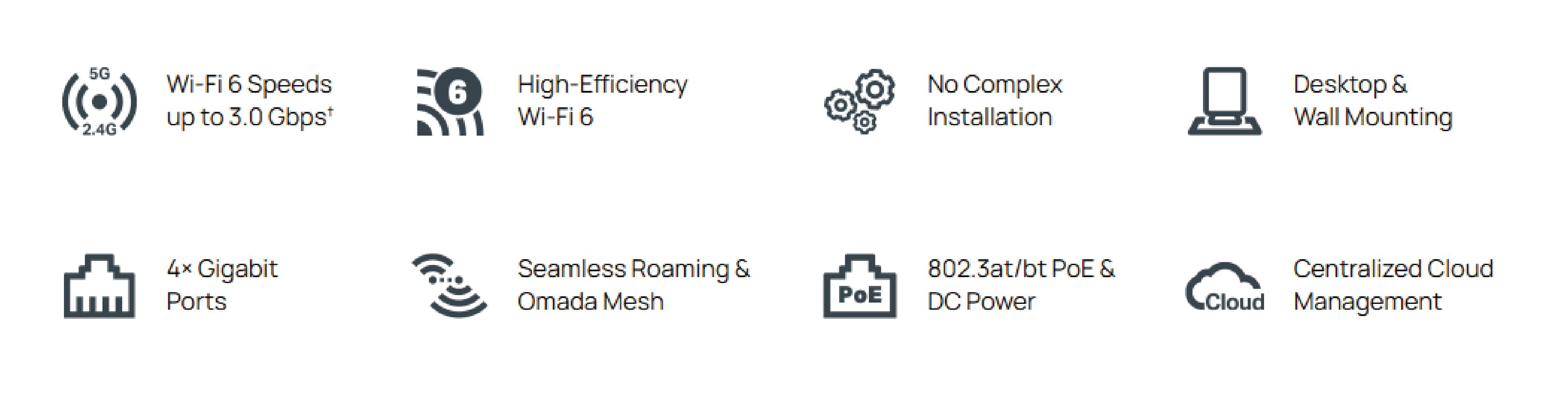 Dzięki kluczowym technologiom Wi-Fi 6, takim jak OFDMA oraz MU-MIMO, urządzenie zapewnia wysoką wydajność, niskie opóźnienia i stabilne działanie w środowiskach o dużym zagęszczeniu użytkowników. Wbudowane mechanizmy, w tym Beamforming, poprawiają efektywność transmisji i zasięg, a protokół WPA3 dba o nowoczesny poziom zabezpieczeń sieci. Kompaktowa konstrukcja stacjonarna (desktop) sprawia, że EAP650-Desktop idealnie sprawdzi się na biurkach, półkach w małych biurach, kawiarniach, placówkach medycznych czy obiektach mieszkalnych, umożliwiając szybkie i estetyczne wdrożenie. Urządzenie wyposażono w port Gigabit Ethernet z PoE (802.3at), co zapewnia elastyczność wdrożenia oraz stabilne zasilanie i szybką transmisję danych.