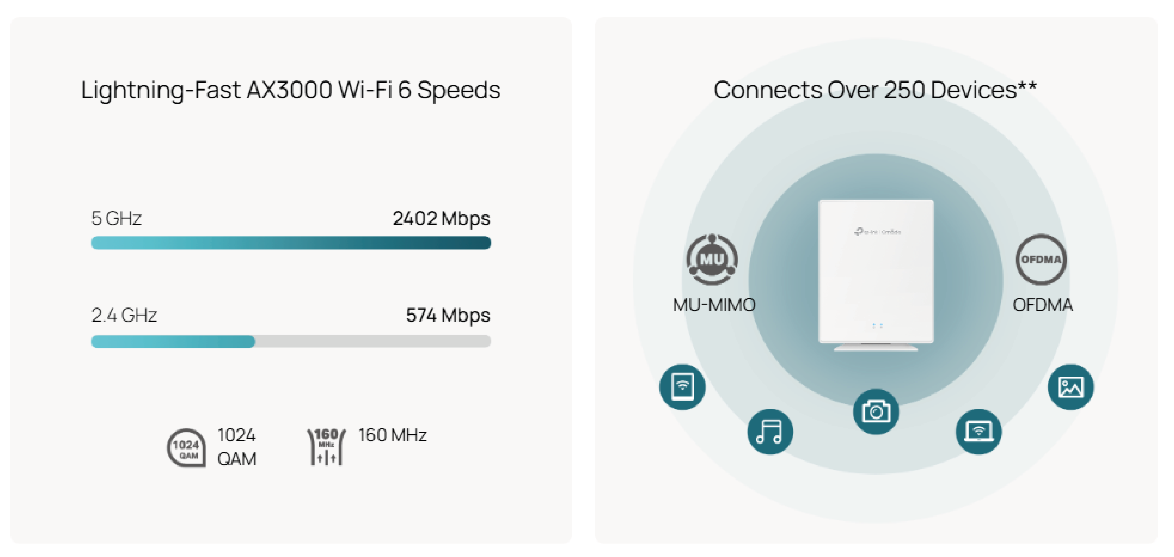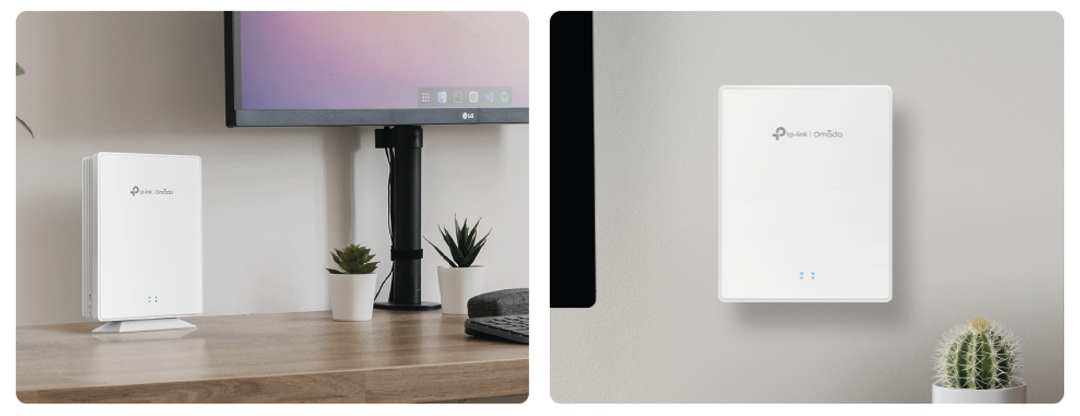 TP-Link EAP650-Desktop to kompaktowy, stacjonarny punkt dostępowy obsługujący standard Wi-Fi 6 (IEEE 802.11ax), działający jednocześnie w pasmach 2,4 GHz i 5 GHz. Oferuje łączną przepustowość do 3000 Mb/s – do 574 Mb/s w paśmie 2,4 GHz oraz 2402 Mb/s w 5 GHz.