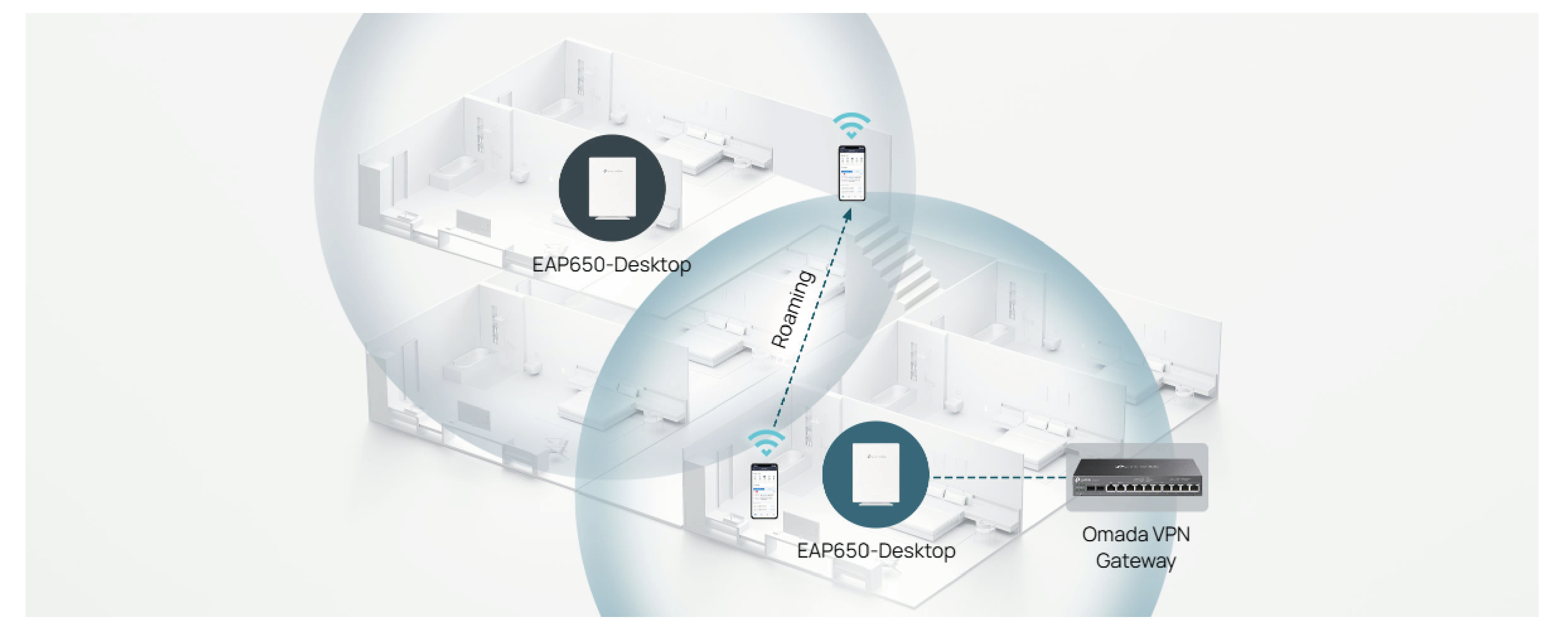 EAP650-Desktop może działać samodzielnie lub być elementem większej infrastruktury zarządzanej przez platformę Omada SDN, która oferuje centralne zarządzanie w chmurze, inteligentne równoważenie obciążenia (Load Balancing), bezproblemowy roaming (Seamless Roaming) oraz pełną kontrolę nad konfiguracją sieci.