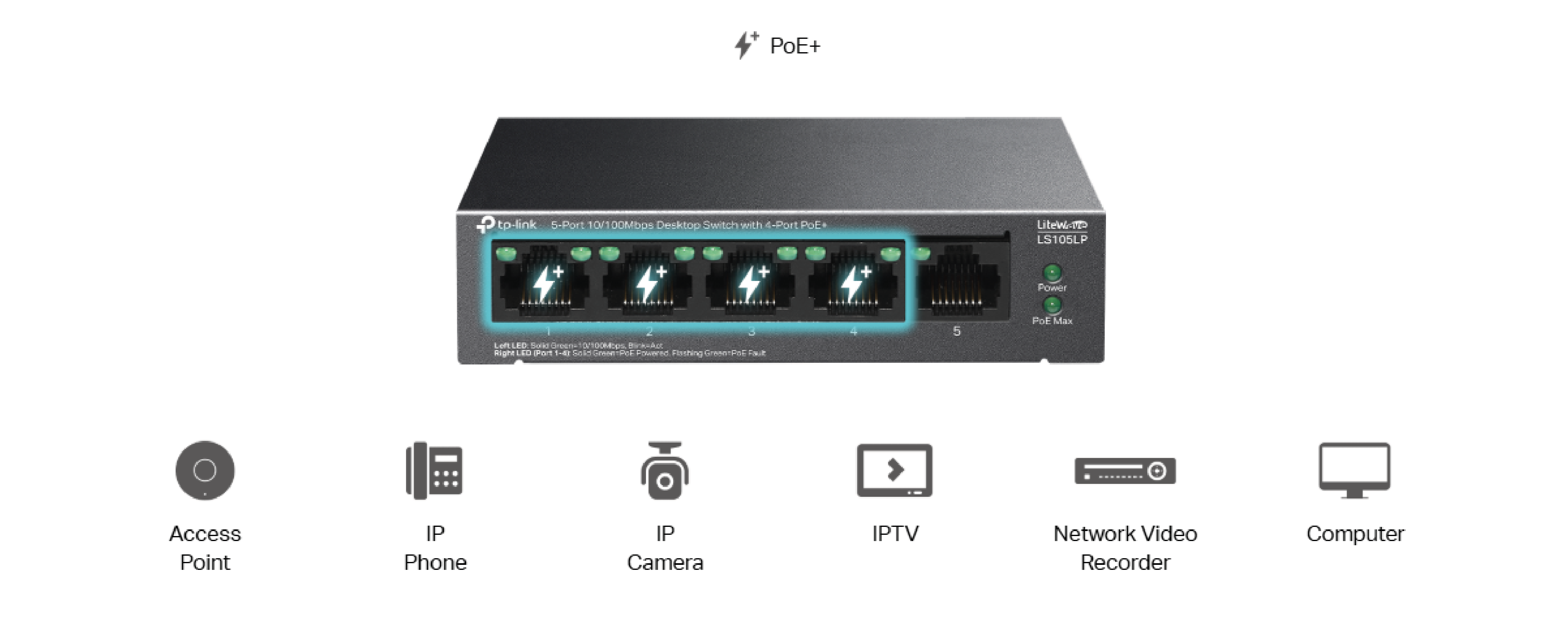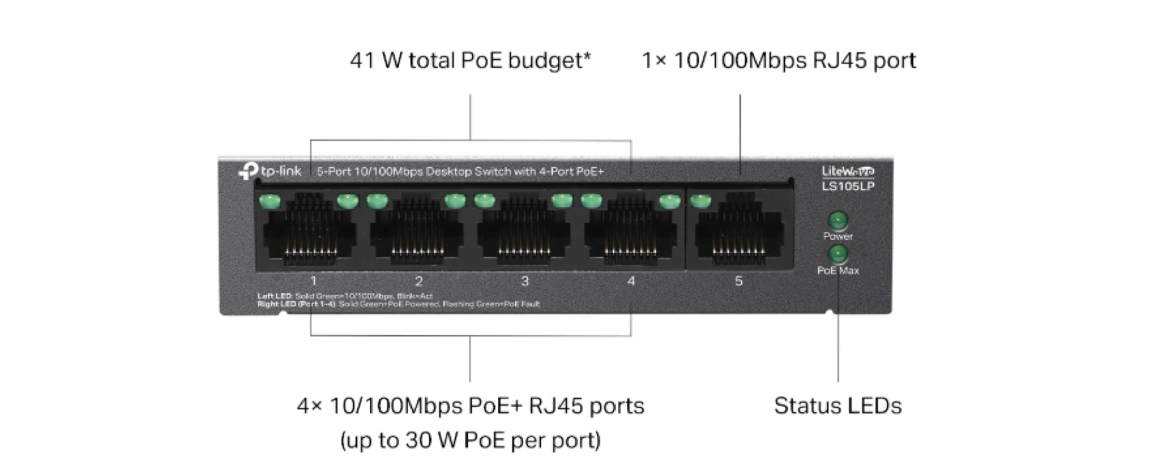 TP-Link LS105LP to biurkowy przełącznik niezarządzalny wyposażony w łącznie 5 portów Fast Ethernet (10/100 Mb/s), zapewniając stabilną łączność dla wszystkich podłączonych urządzeń w sieci lokalnej. Spośród tych portów, 4 porty Ethernet (Porty 1–4) obsługują zasilanie w standardzie PoE+ (802.3af/at), z maksymalną mocą wyjściową do 30 W na pojedynczy port, co umożliwia zasilanie urządzeń końcowych, takich jak punkty dostępowe Wi-Fi, telefony VoIP czy kamery IP. Łączny budżet mocy PoE dla całego urządzenia wynosi 40 W. LS105LP działa w trybie Plug and Play i nie wymaga konfiguracji ani zarządzania programowego, jednak oferuje on dwa tryby pracy przełączane za pomocą fizycznego suwaka: tryb "Extend" zwiększa zasięg zasilania i transmisji danych PoE na portach 1-4 do 250 metrów, kosztem ograniczenia przepustowości do 10 Mb/s, natomiast tryb "Priority" zapewnia priorytet zasilania portom o najwyższej numeracji w celu ochrony przed przeciążeniem całkowitego budżetu PoE w przypadku podłączenia zbyt wielu energochłonnych urządzeń. Urządzenie charakteryzuje się metalową obudową typu desktop i jest wyposażone w pasywne chłodzenie (bezwentylatorowe), co gwarantuje cichą pracę; switch można postawić na biurku lub półce albo zamontować na ścianie przy użyciu dołączonego zestawu.