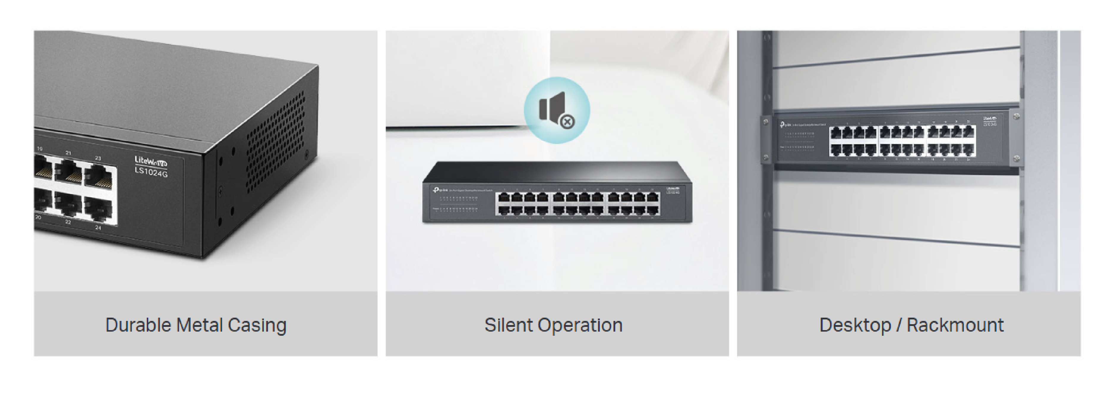 Wytrzymała metalowa obudowa LS1024G zapewnia efektywne odprowadzanie ciepła, doskonałe zapobieganie zakłóceniom sygnału, stabilność działania sprzętu oraz długą żywotność sieci. Bezwentylatorowa konstrukcja redukuje zużycie energii i generowany hałas, dzięki czemu jest idealna do środowisk wrażliwych na szum. Ponadto, przełącznik można postawić na biurku lub zamontować w szafie Rack zgodnie z własnymi potrzebami.