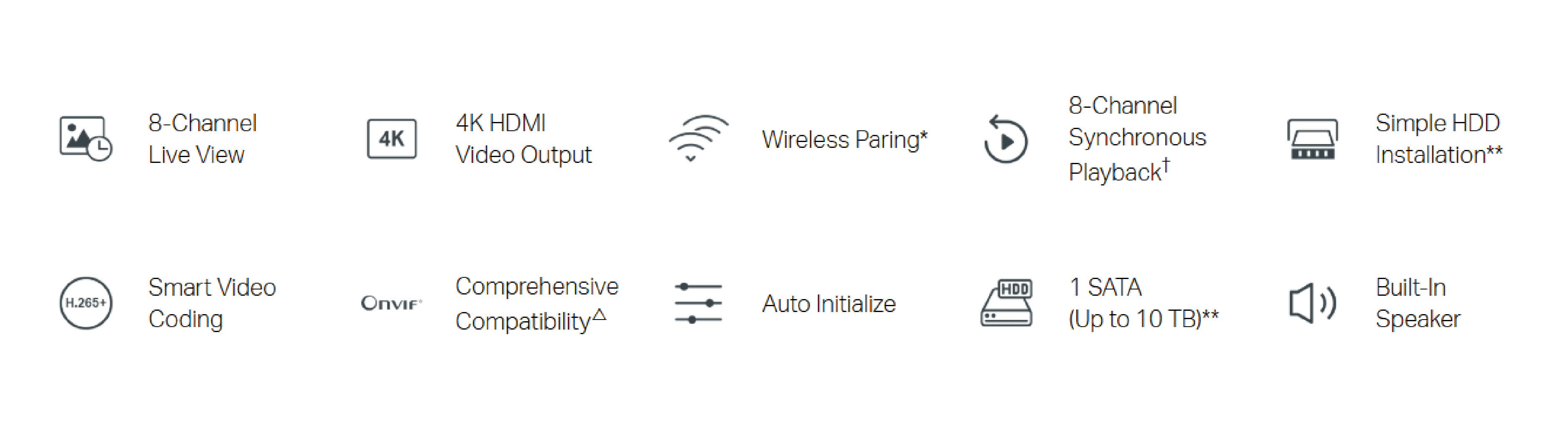 Wyróżnia go wbudowany moduł Wi-Fi z trybem routera, który umożliwia bezprzewodowe parowanie z kamerami VIGI, ułatwiając instalację. Ważnym atutem jest wsparcie H.265+ – nowoczesnego, wydajnego kodowania danych, które umożliwia zmniejszenie rozmiaru zapisywanych nagrań oraz bitrate'u. Rejestrator wspiera standard ONVIF, co pozwala na wykorzystanie go również z kamerami IP innych producentów.