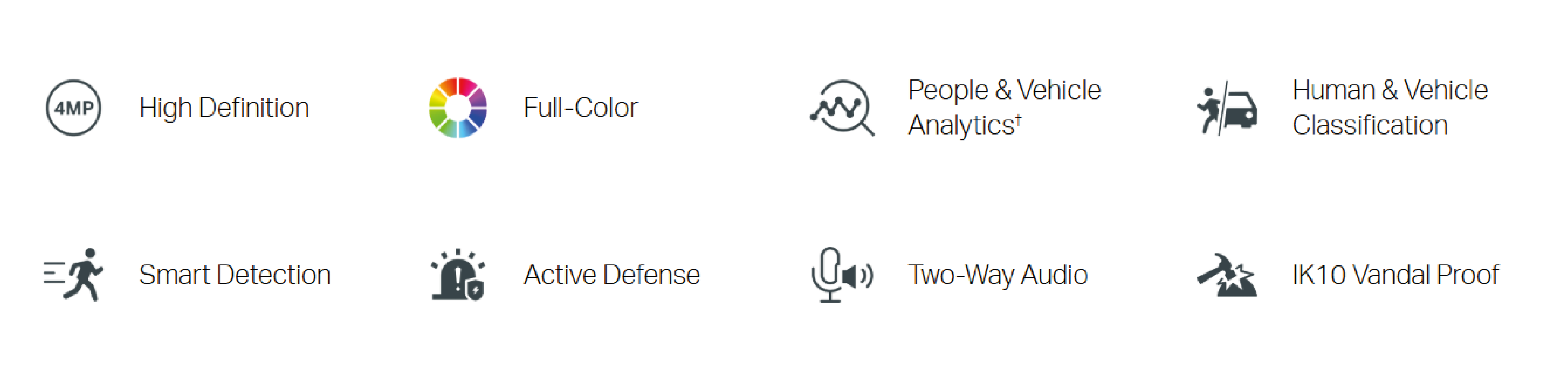 | Zdarzenia podstawowe | Wykrywanie ruchu (wspomagane przez Klasyfikację ludzi i pojazdów, w celu uzyskania dokładniejszych alertów) Wykrywanie manipulacji kamerą Wyjątek (błędne logowanie) |
