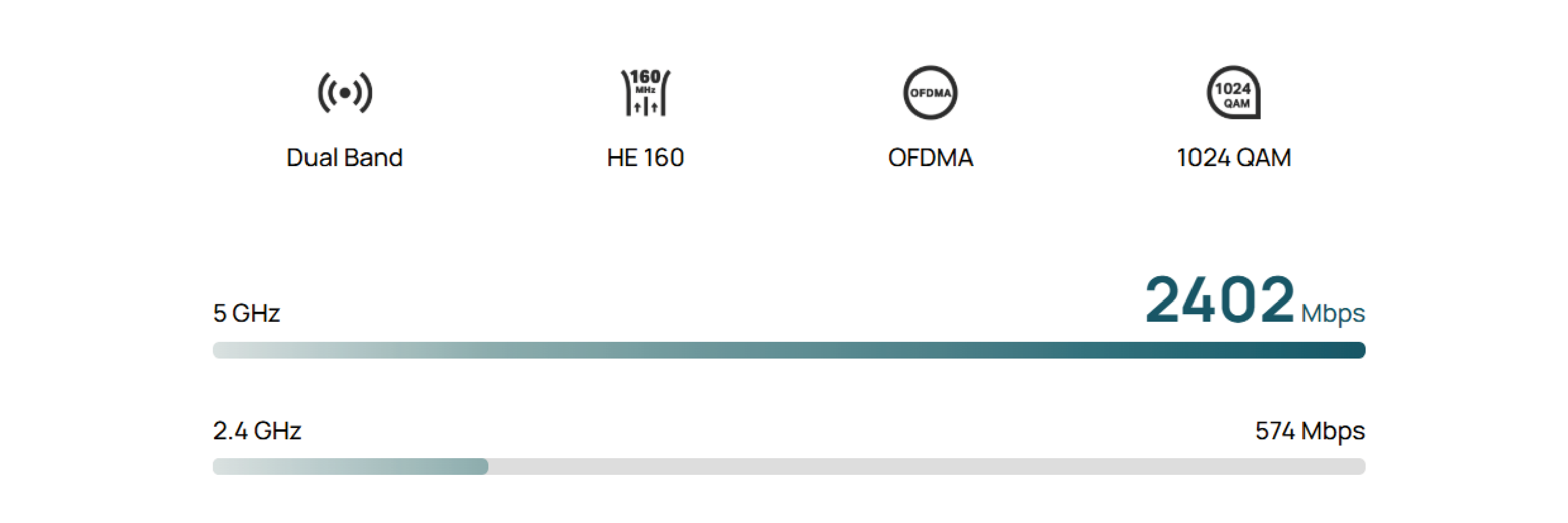 | Częstotliwość Wi-Fi i Szybkość transferu | 2,4 GHz: 574 Mb/s 5 GHz: 2402 Mb/s (HE160) |