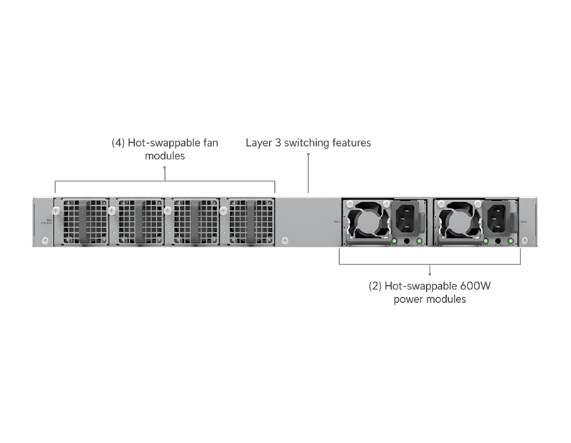 Urządzenie zostało przystosowane do pracy bezprzerwowej. Posiada 2 zasilacze, które mogą pracować w trybie Reundant - w przypadku awarii jednego pracę podejmuje drugi. Switch posiada 4 moduły wentylacyjne typu hot-swap, pracują w trybie redundantym 3+1. Wszystkie powyższe moduły możesz dokupić osobno i wymienić bez wyłączania switcha.