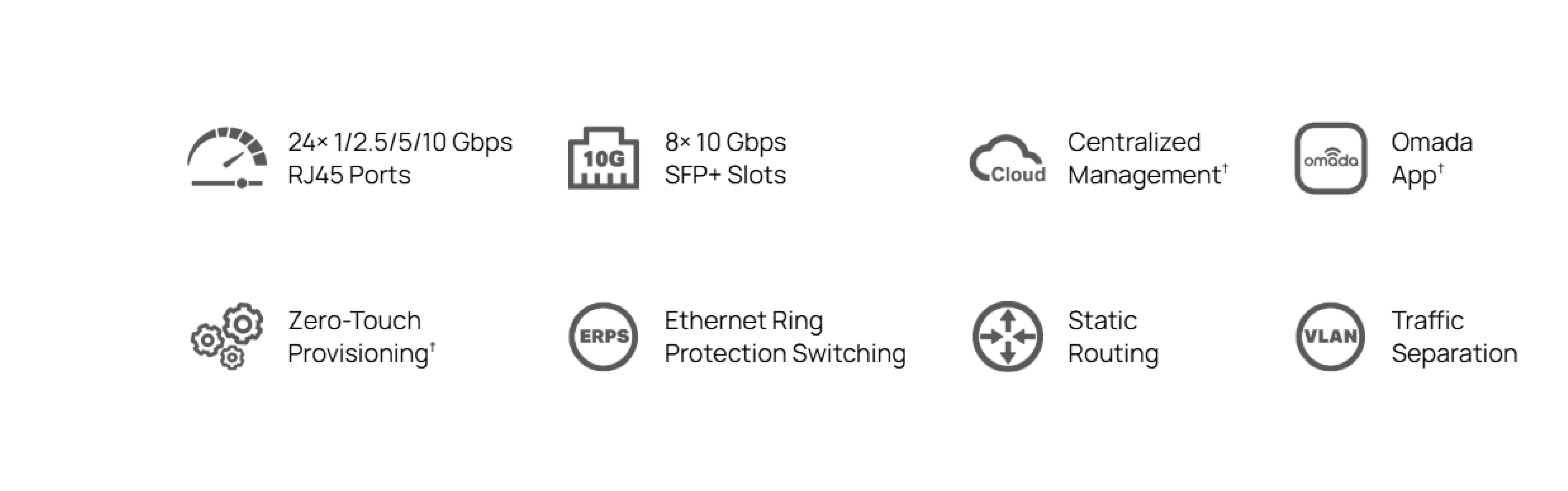 | Funkcje L2 i L2+ | 128 interfejsów IP: obsługa interfejsów IPv4/IPv6 Statyczny Routing: 48 statycznych tras IPv4/IPv6 Statyczny ARP: 128 statycznych wpisów 510 wpisów ARP Proxy ARP Gratuitous ARP DHCP Serwer DHCP Relay: DHCP Interface Relay, DHCP VLAN Relay DHCP L2 Relay Agregacja łączy Spanning Tree Protocol (STP) Wykrywanie pętli zwrotnych (Loopback) Kontrola przepływu 802.3x Mirroring |