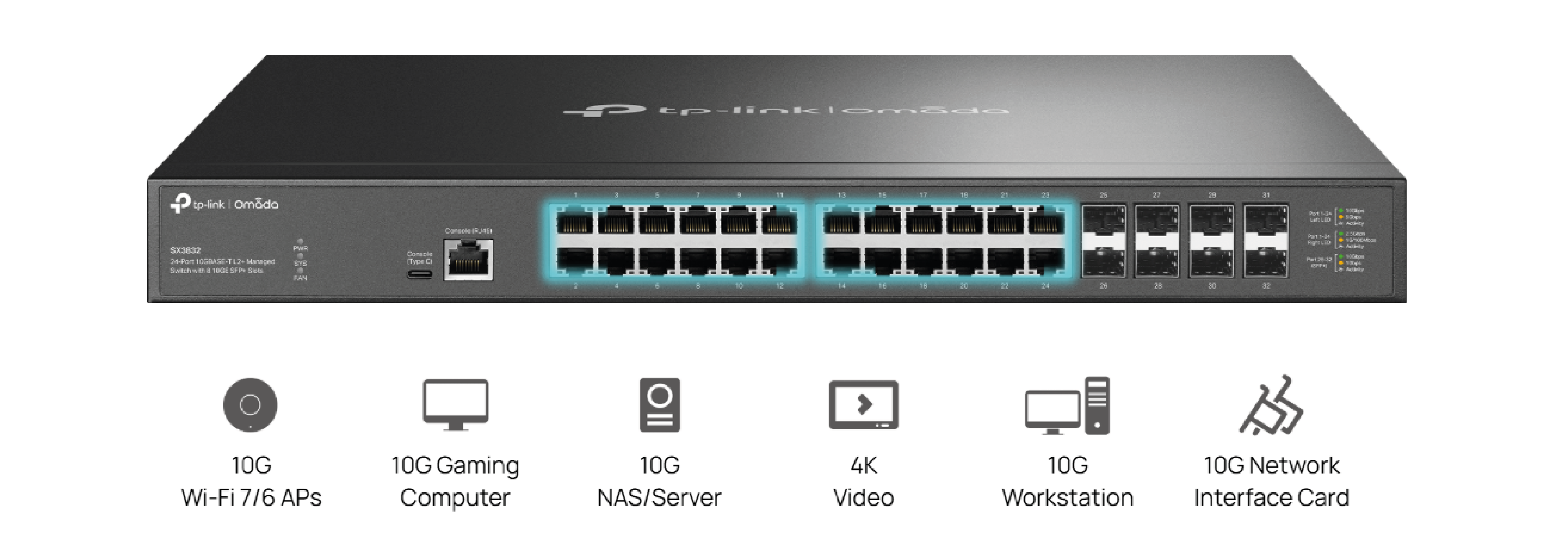 SX3832 to profesjonalny, zarządzalny przełącznik agregujący warstwy L2+, w pełni kompatybilny z systemem Omada SDN. Jest to urządzenie stackowalne, przeznaczone do pracy jako element dystrybucyjny lub szkieletowy w rozbudowanych, wymagających sieciach. Przełącznik oferuje 24 porty 10GBASE-T (RJ45, z obsługą Multi-Gig 10G/5G/2.5G/1G) oraz 8 slotów SFP+ 10GE do ultraszybkich połączeń światłowodowych, agregacji i stackowania. Należy zaznaczyć, że model SX3832 nie obsługuje zasilania Power over Ethernet (PoE).
