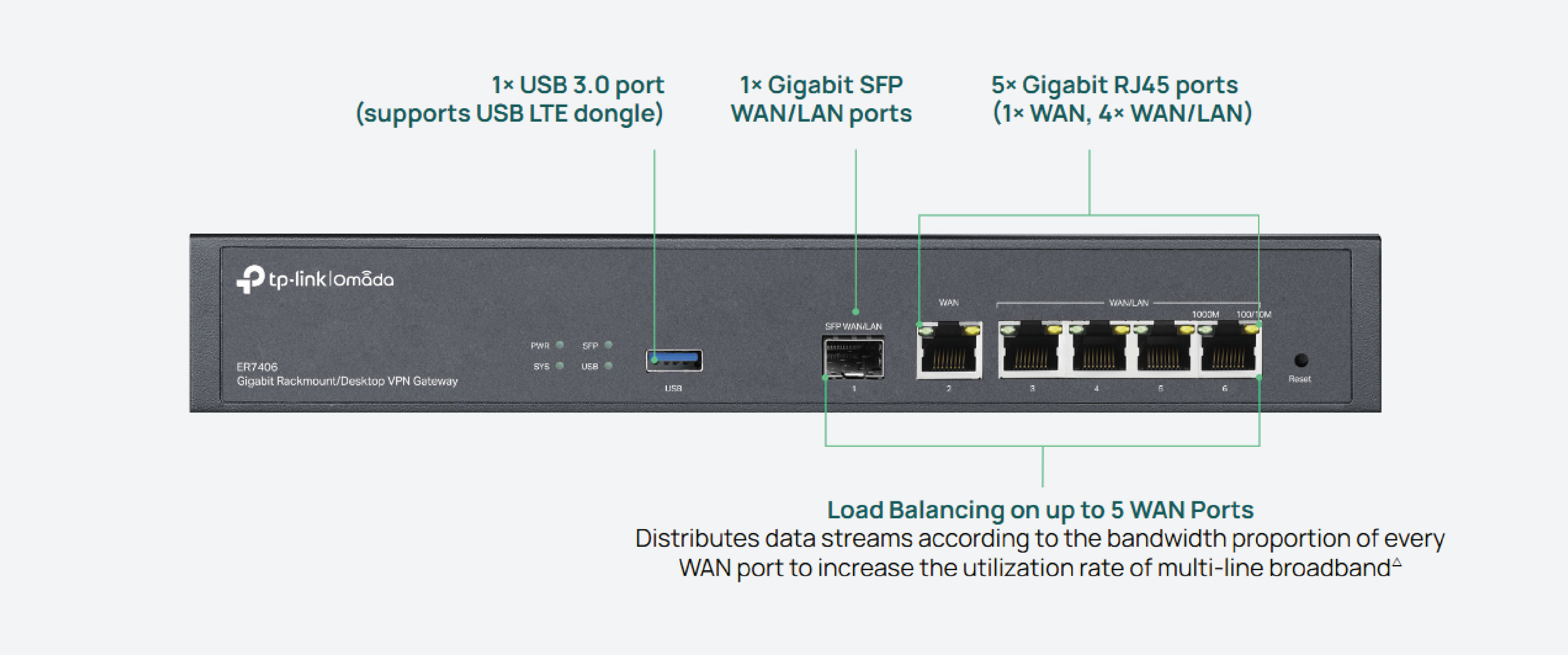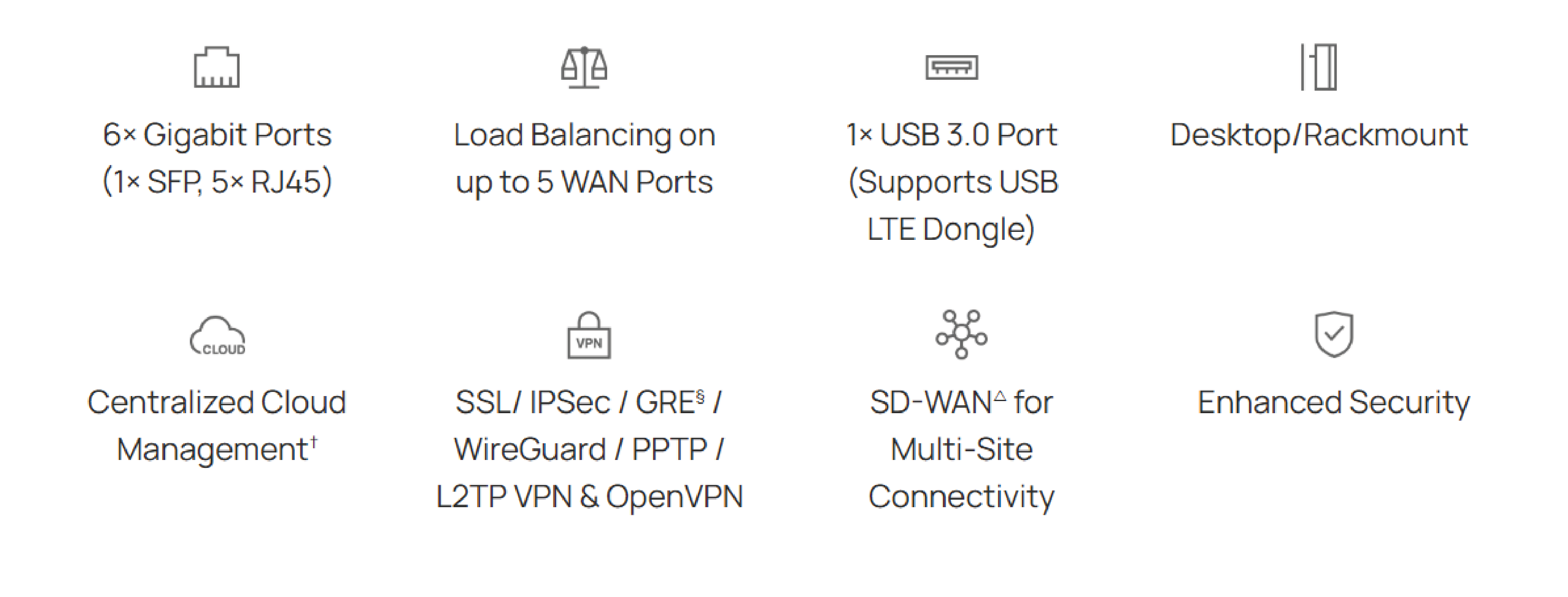 | Porty | 1 Gigabitowy slot SFP WAN/LAN 1 Gigabitowy port WAN 4 Gigabitowe porty LAN/WAN 1 Port USB 3.0 (obsługujący Pamięć masową USB i Modemy LTE USB) |