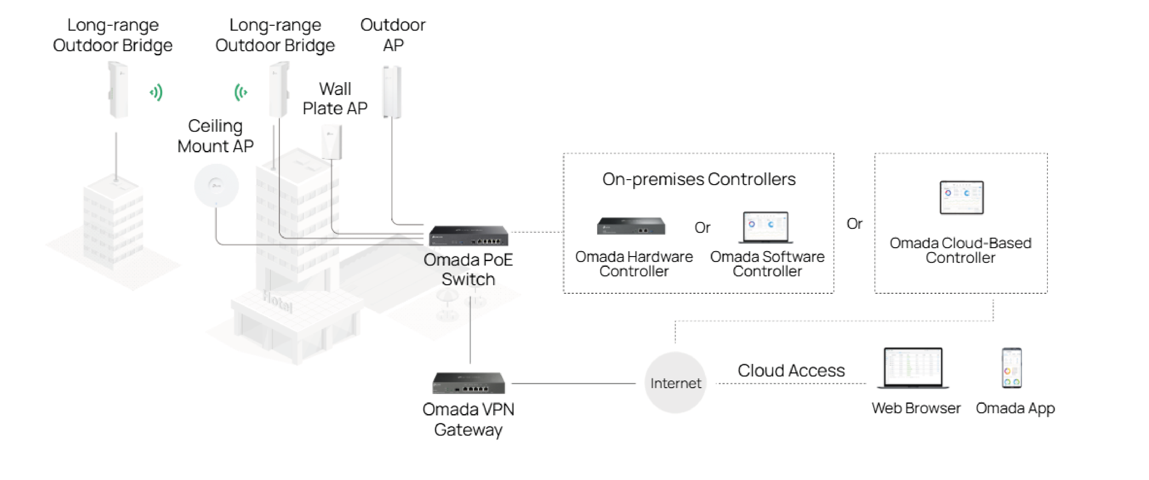 | Scentralizowane zarządzanie | Kontroler Omada oparty na Chmurze Kontroler sprzetowy Omada Kontroler programowy Omada |