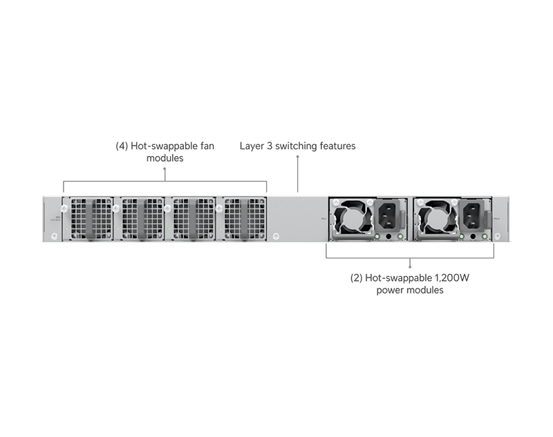 Urządzenie zostało przystosowane do pracy bezprzerwowej. Posiada 2 zasilacze, które mogą pracować w trybie Redundant - w przypadku awarii pracę podejmuje drugi. Switch posiada 4 moduły wentylacyjne typu hot-swap, pracują w trybie redundantnym 3+1. Wszystkie powyższe moduły możesz dokupić osobno i wymienić bez wyłączania switcha.