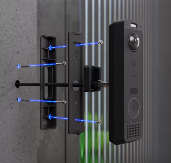 Ubiquiti G6 Entry to czytnik / dzwonek przeznaczony do pracy w systemie UniFi Access. Posiada dwie kamery, jedną o rozdzielczości 5 Mpix skierowaną na wprost, drugą o rozdzielczości 8 Mpix skierowaną w dół. Pierwsza z nich służy do prowadzenia wideorozmowy z osobą odwiedzającą, jej pole widzenia wynosi 100° poziomo i 135° pionowo (przekątna 180°). Druga została zaprojektowana z myślą o obserwacji paczek zostawionych przez kurierów, jej kąt widzenia wynosi 66° poziomo i 51,7° pionowo (przekątna 78°). Czytnik jest wyposażony w fizyczny przycisk dzwonka, do prowadzenia wideorozmowy posiada wbudowany mikrofon i głośnik. Użytkownicy mogą otwierać drzwi z poziomu aplikacji, przy pomocy karty NFC / keyfob lub Apple/Google Wallet. Kamera wspiera rozpoznawanie twarzy i inteligentne wykrywanie ludzi, pojazdów i zwierząt. Obudowa cechuje się stopniem ochrony IP55, jest przystosowana do montażu na ścianie lub puszce podtynkowej. W zestawie znajdziesz niezbędne akcesoria montażowe, w tym również uchwyt pozwalający na montaż pod kątem. Z tyłu obudowy umieszczono port 1G Ethernet, który jednocześnie służy za wejście zasilania PoE+ (802.3at), czytnik należy podłączyć bezpośrednio do huba UniFi Access.