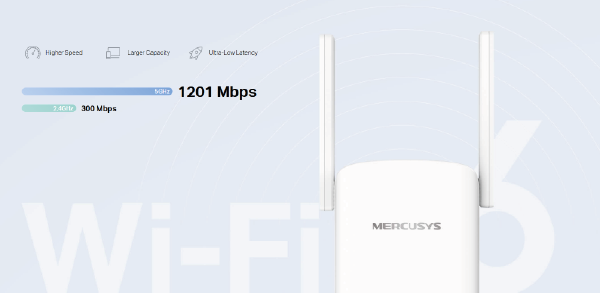 Urządzenie jest kompatybilne ze standardem Wi-Fi 6, może pracować w pasmach 2,4 i 5 GHz jednocześnie. W 2,4 GHz obsługuje protokoły IEEE 802.11 b/g/n, w 5 GHz IEEE 802.11 a/n/ac/ax. Maksymalna teoretyczna przepustowość wynosi odpowiednio 300 Mb/s w 2,4 GHz oraz 1201 Mb/s w 5 GHz. ME60X jest w pełni kompatybilny wstecz ze starszymi standardami, możesz go z powodzeniem wykorzystać jeżeli twój aktualny router obsługuje Wi-Fi 5 lub nawet Wi-Fi 4.