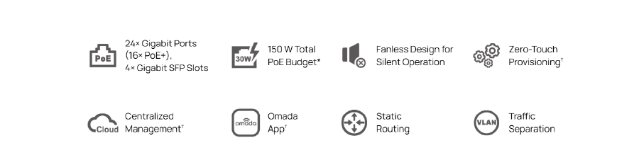 | Porty PoE (RJ45) | Zgodność ze standardami: 802.3at/af 16 portów PoE+, do 30 W na port Łączna moc zasilania PoE: 150 W* |
