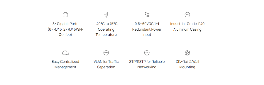 | Porty | 6 portów RJ45 10/100/1000 Mb/s 2 gigabitowe porty combo SFP/RJ45 Automatyczna negocjacja / Automatyczne MDI/MDIX |