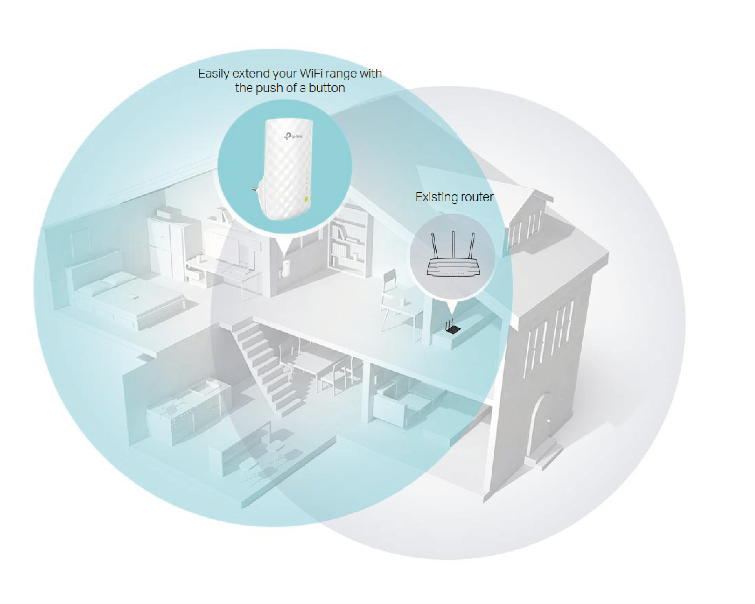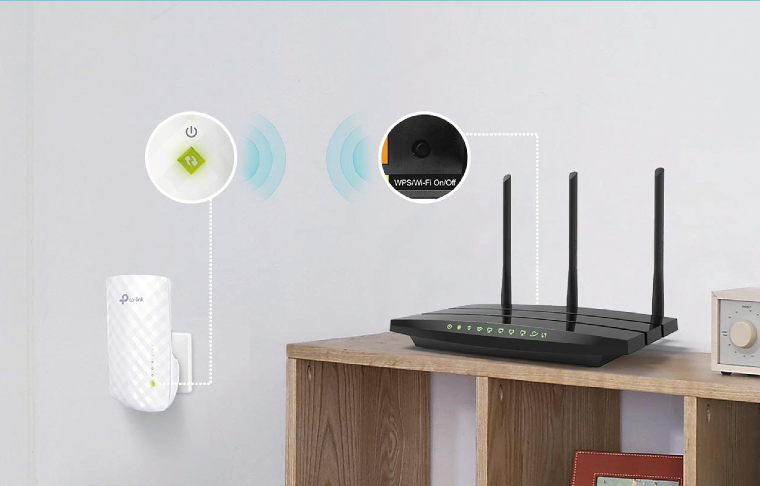 Wystarczy tylko nacisnąć przycisk WPS na routerze, a następnie przycisk RE na wzmacniaczu. Po uzyskaniu połączenia z routerem możesz przenieść RE200 w dowolne miejsce, znajdujące się w zasięgu sieci bezprzewodowej.