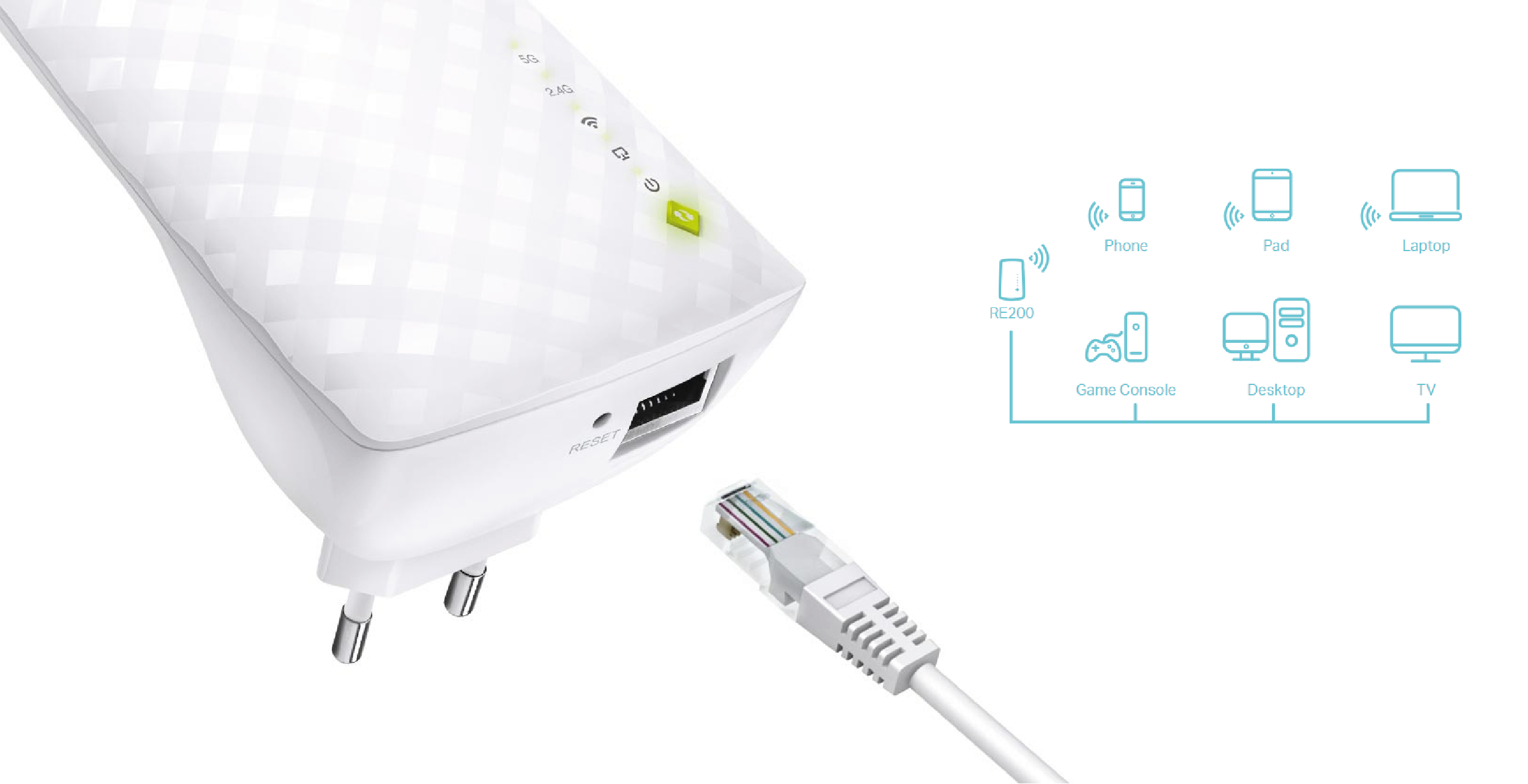 TP-Link RE200 to dwuzakresowy (dual-band) wzmacniacz sygnału (repeater) mogący pracować w pasmach 2,4 i 5 GHz jednocześnie. Wyposażony jest w jeden port fast Ethernet, wpina się go bezpośrednio do gniazdka elektrycznego (EU plug). Konfiguracja odbywa się w prosty i intuicyjny sposób, jedną z możliwości sparowania urządzeń jest WPS.