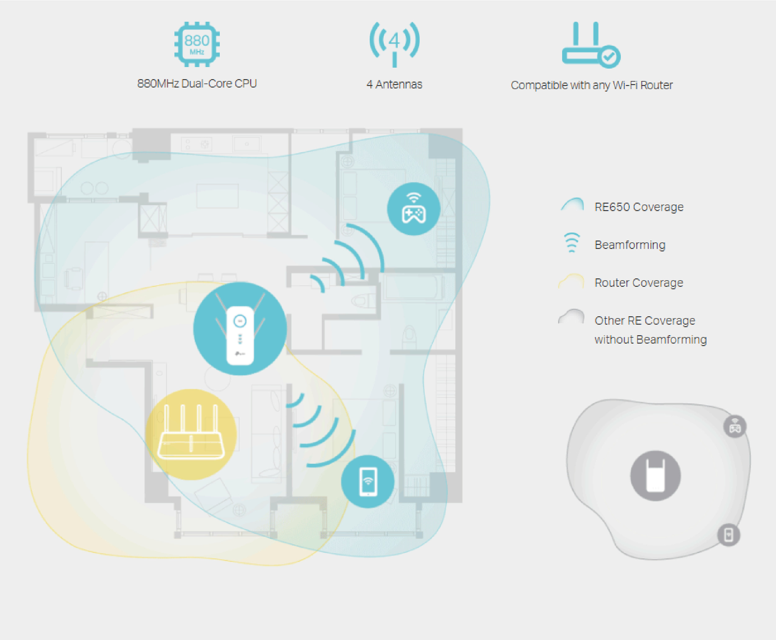 Wyposażony w cztery zewnętrzne, dwupasmowe anteny, RE650 pozwala utworzyć stabilne połączenia bezprzewodowe z każdym routerem Wi-Fi oraz zwiększyć zasięg sieci. Dwurdzeniowy procesor 880MHz zapewnia maksymalną wydajność Wi-Fi i połączenie Twoim smartfonom oraz tabletom na powierzchni całego domu. Technologia transmisji kierunkowej umożliwia wykrywanie lokalizacji urządzeń i przesyłanie im sygnału Wi-Fi, zapewniając stabilne połączenia.