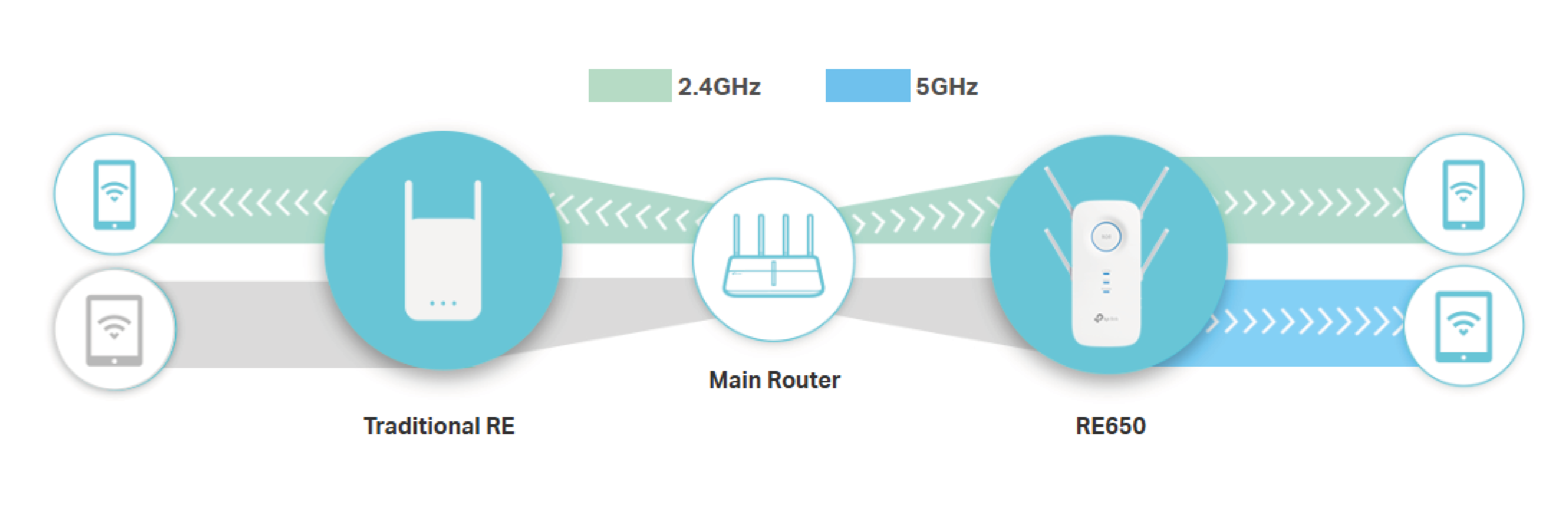 Jeżeli jedno z pasm routera utraci nagle połączenie, lub w przypadku gdy router główny jest urządzeniem jednopasmowym, RE650 zapewni klientom stabilne połączenia w dwóch pasmach, a Tobie niczym niezakłócone działania na wszystkich urządzeniach.