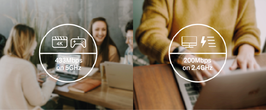Archer T2U Nano obsługuje dwa oddzielne pasma Wi-Fi. Dzięki technologii 256QAM urządzenie zapewnia o 33% większą wydajność sieci - prędkość w paśmie 2,4GHz wynosi nie 150, a 200Mb/s. 433Mb/s w paśmie 5GHz to prędkość idealna do strumieniowania wideo w jakości HD i wrażliwych na opóźnienia gier online, podczas gdy 200Mb/s w paśmie 2,4GHz idealnie sprawdzi się do codziennego przeszukiwania sieci.