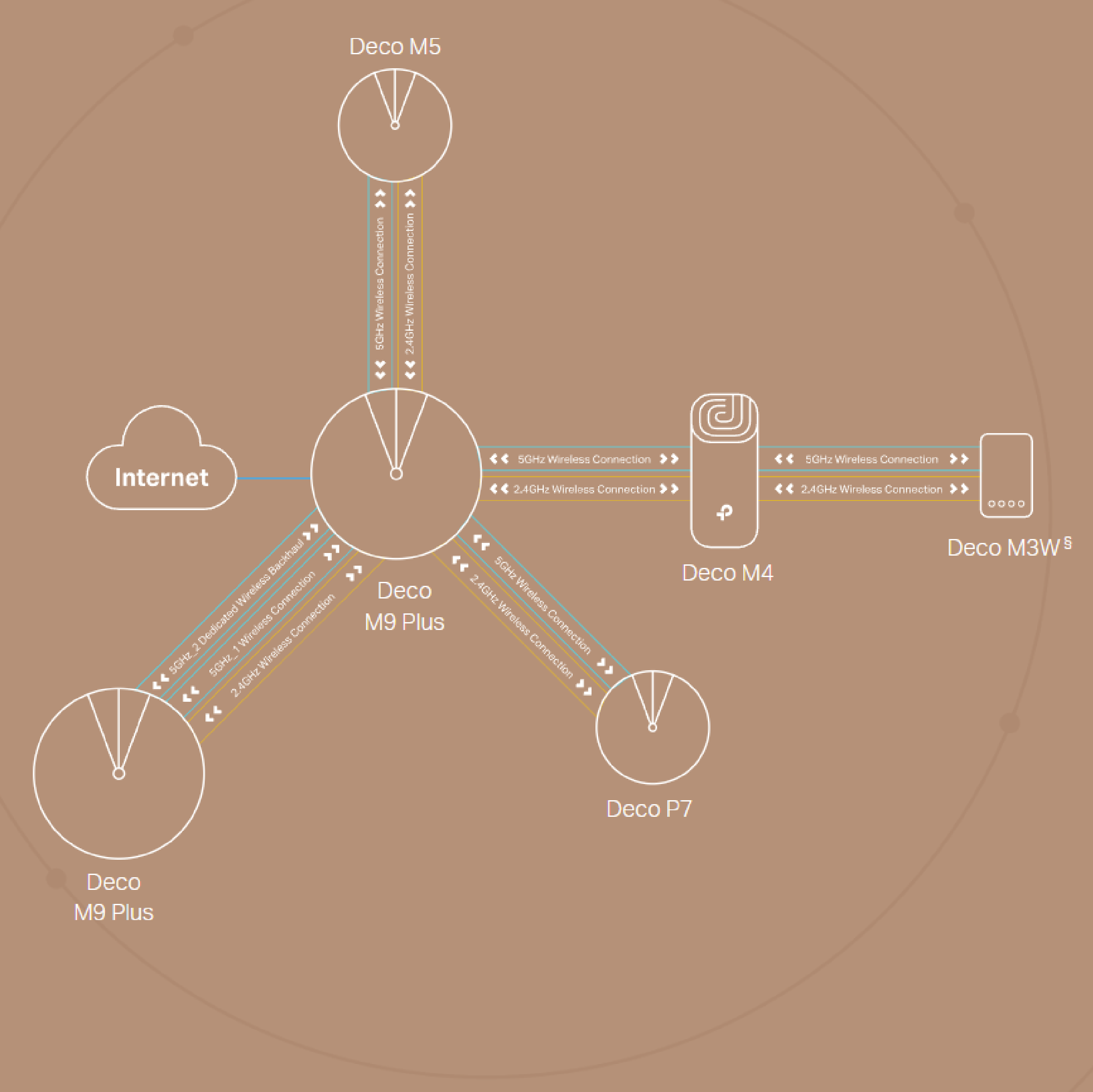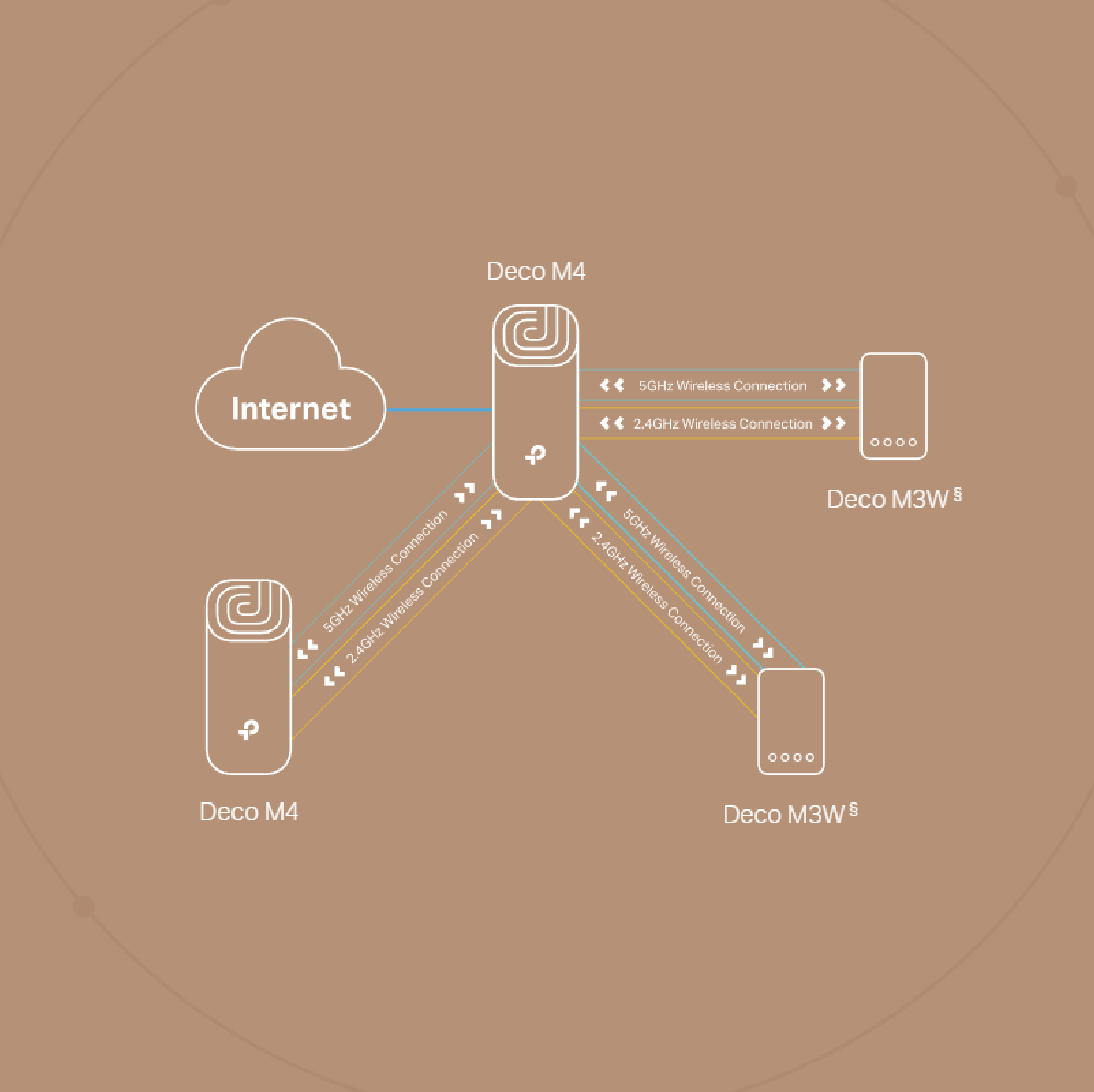 Deco M4 może stworzyć sieć Mesh z każdym innym modelem Deco. Aby zwiększać zasięg sieci, wystarczy dodawać do niej kolejne jednostki Deco.