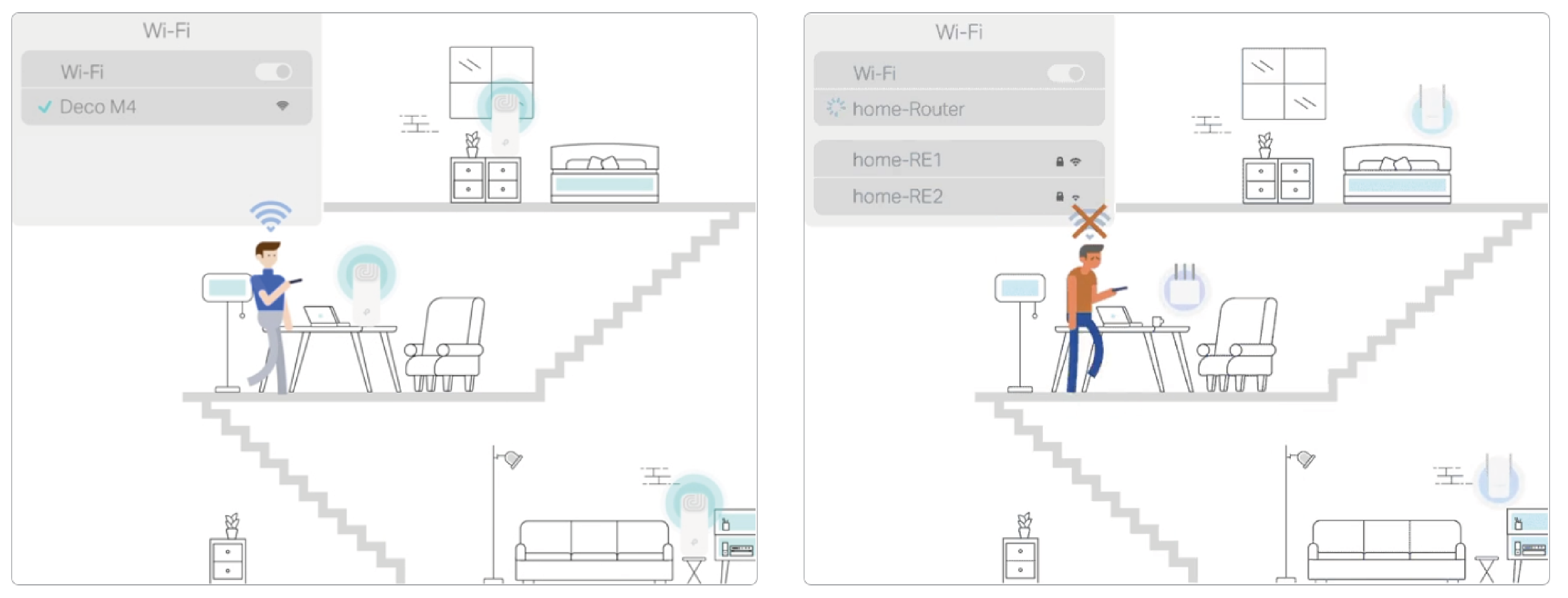 Routery Deco współpracują ze sobą, aby tworzyć jednolitą sieć Wi-Fi. Podczas przemieszczania się po domu twój telefon lub tablet zawsze połączy się z routerem Deco, który oferuje mu najlepsze połączenie — bez przerywania transferu.
