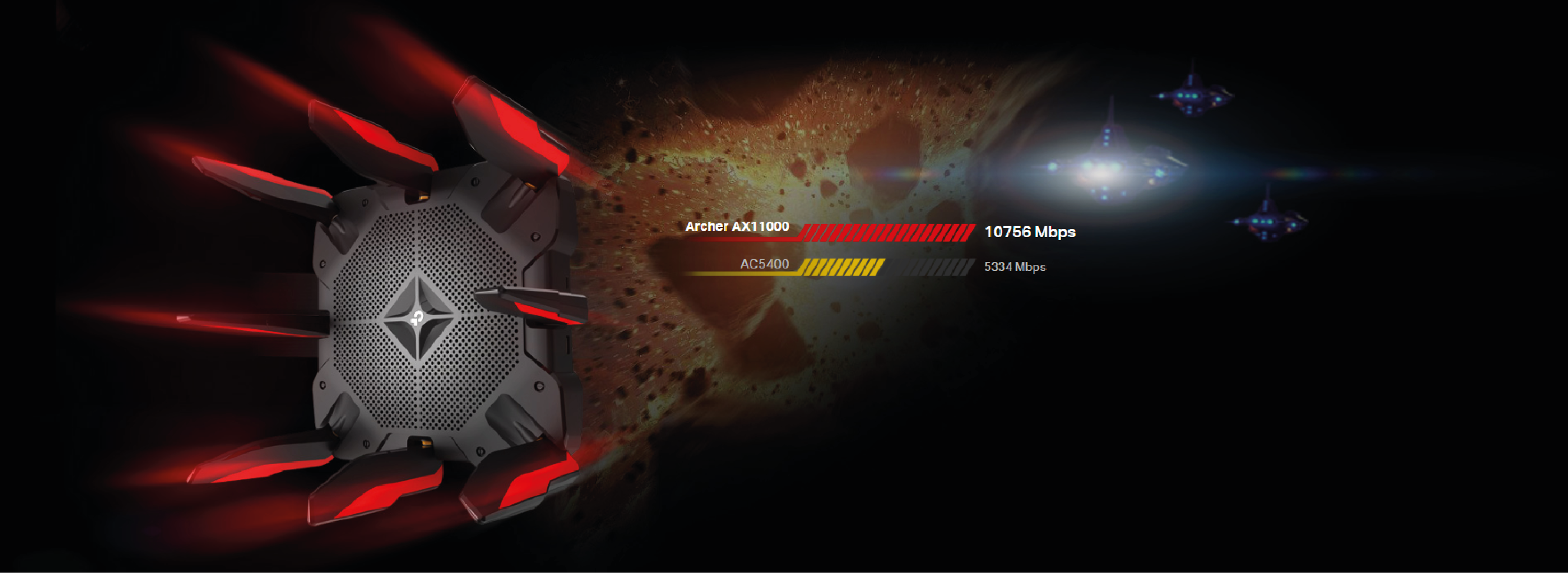 TP-Link Archer AX11000 to trójzakresowy router bezprzewodowy klasy AX11000 pracujący w standardzie Wi-Fi 6 (IEEE 802.11ax). Urządzenie oferuje maksymalną sumaryczną przepustowość teoretyczną 10756 Mb/s (1148 Mb/s} w 2.4 GHz i dwa pasma 5 GHz po 4804 Mb/s). Wykorzystuje technologię 4x4 MU-MIMO do efektywnej obsługi wielu urządzeń jednocześnie oraz Beamforming do optymalizacji zasięgu przez osiem zewnętrznych anten. Łączność przewodową zapewnia port 2.5G Ethernet WAN oraz osiem portów Gigabit Ethernet LAN. Sercem urządzenia jest czterordzeniowy procesor 1.8 GHz wspomagany przez 1 GB pamięci RAM. Router zawiera specjalne funkcje dla graczy, w tym Game Accelerator i Game Protector.