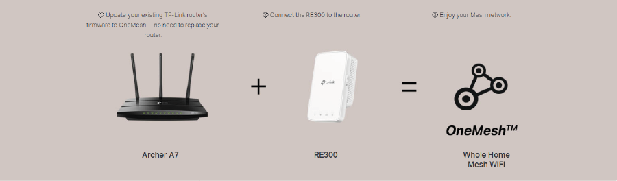 TP-Link RE300 to wzmacniacz sygnału przystosowany do sieci Mesh. Może pracować w pasmach 2,4 i 5 GHz jednocześnie, obsługuje standardy IEEE 802.11 b/g/n (2,4 GHz) i IEEE 802.11 a/n/ac (5 GHz). Wykorzystuje 2x2 MIMO, maksymalna teoretyczna przepustowość wynosi 300 Mb/s w paśmie 2,4 GHz oraz 867 Mb/s w paśmie 5 GHz. Urządzenie wpina się bezpośrednio do gniazdka elektrycznego, zajmuje niewiele miejsca i nie rzuca się w oczy.