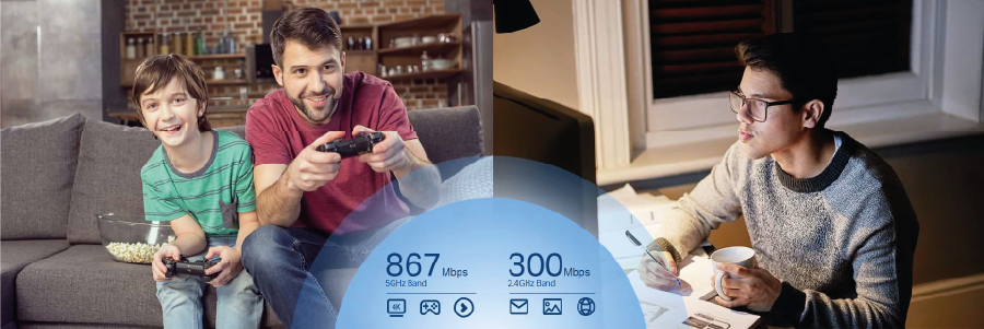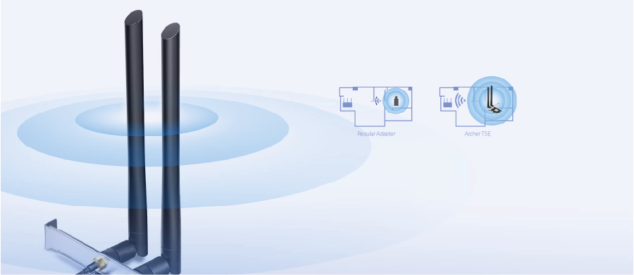 Archer T5E to dwupasmowa karta sieciowa PCI Express w standardzie 802.11ac z obsługą połączeń bezprzewodowych o łącznej prędkości sięgającej 1167 Mb/s (867 Mb/s w paśmie 5 GHz i 300 Mb/s w paśmie 2,4 GHz), rozdzielająca sygnał Wi-Fi na dwa pasma w celu zwiększenia funkcjonalności działania. Jeśli interesuje cię wyłącznie przeglądanie stron internetowych, pisanie maili i śledzenie aktualności w mediach społecznościowych, połącz się z pasmem 2,4 GHz. Natomiast jeśli jesteś zapalonym graczem, pobierasz dużo plików lub po prostu chcesz obejrzeć film w dobrej jakości, wybierz pasmo 5 GHz.