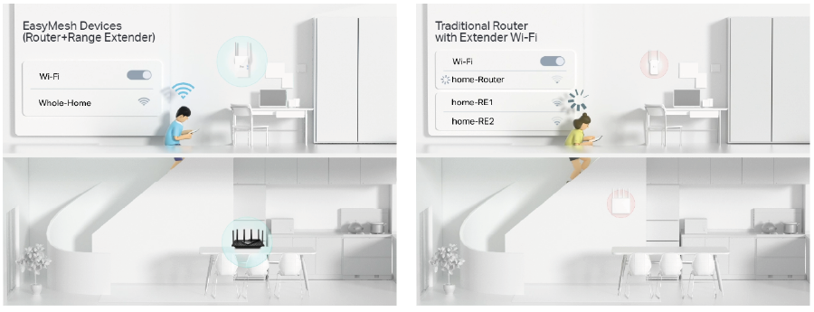 Technologia OneMeshTM to łatwy sposób na utworzenie jednolitej sieci mesh, obejmującej swoim zasięgiem całą powierzchnię domu. Wystarczy, że podłączysz wzmacniacz sygnału z technologią OneMeshTM do routera OneMeshTM. Nie musisz już błądzić po domu w poszukiwaniu stabilnego połączenia!