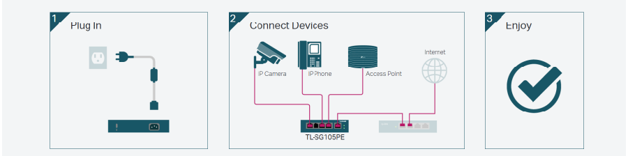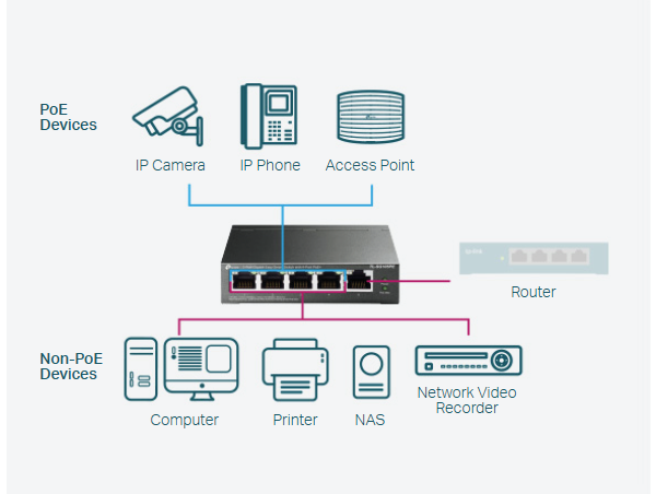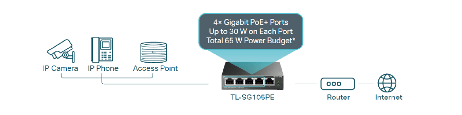 Przełącznik TL-SG105PE jest w pełni zgodny z urządzeniami zasilanymi PoE, takimi jak kamery IP, punkty dostępowe i telefony IP. Współpracuje także z urządzeniami przewodowymi bez obsługi PoE - komputerami, drukarkami oraz IPTV.