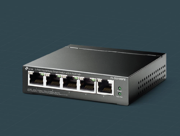 TP-Link TL-SG105PE to przełącznik klasy Easy Smart (pół-zarządzalny), zaprojektowany do zastosowań w małych sieciach, które wymagają podstawowych funkcji zarządzania i zasilania urządzeń końcowych. Urządzenie oferuje 5 portów Gigabit Ethernet (10/100/1000 Mb/s) RJ45. Spośród nich, 4 porty wspierają funkcję zasilania przez Ethernet (PoE Out) w standardach IEEE 802.3af i 802.3at (PoE+), z maksymalną łączną mocą budżetu PoE wynoszącą 65 W. Przełącznik, mimo iż jest pół-zarządzalny, zapewnia podstawowe funkcje konfiguracyjne dostępne przez interfejs webowy lub narzędzie konfiguracyjne, w tym monitoring sieci, mirroring portów, QoS oparty na porcie/802.1p/DSCP oraz proste funkcje VLAN (Port/Tag-based). Urządzenie charakteryzuje się kompaktową, metalową obudową i konstrukcją bez wentylatora (fanless), co zapewnia cichą pracę i nadaje się do montażu na ścianie lub na biurku.