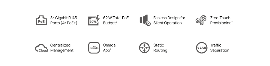 | Porty | 8 portów RJ45 10/100/1000 Mb/s (porty 1-4 z obsługą PoE 802.3at/af ) Autonegocjacja/Auto MDI/MDIX |