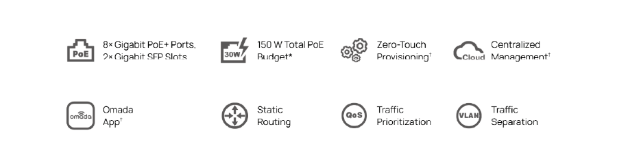 | Porty PoE+ (RJ45) | Zgodność ze standardem 802.3at/af 8 Portów PoE+ Łączne zasilanie: 150 W |