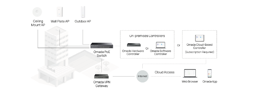 | Zarządzanie centralne | • Kontroler Omada oparty na Chmurze • Kontroler sprzętowy Omada (OC300) • Kontroler sprzętowy Omada (OC200) • Kontroler programowy Omada |