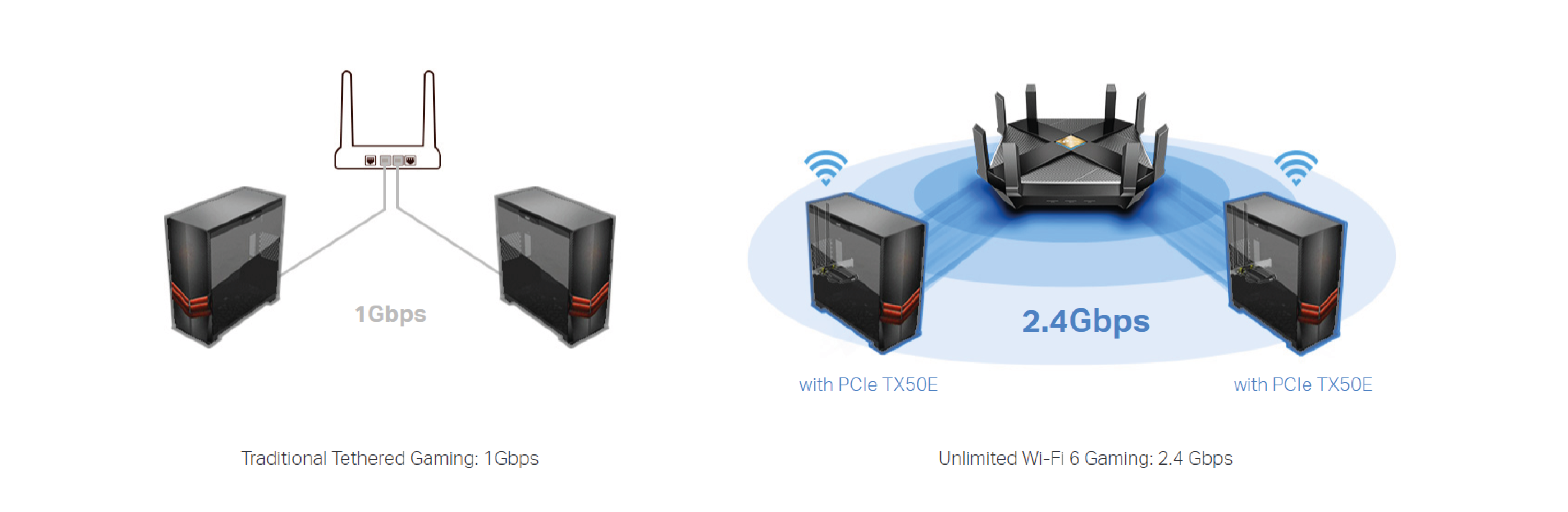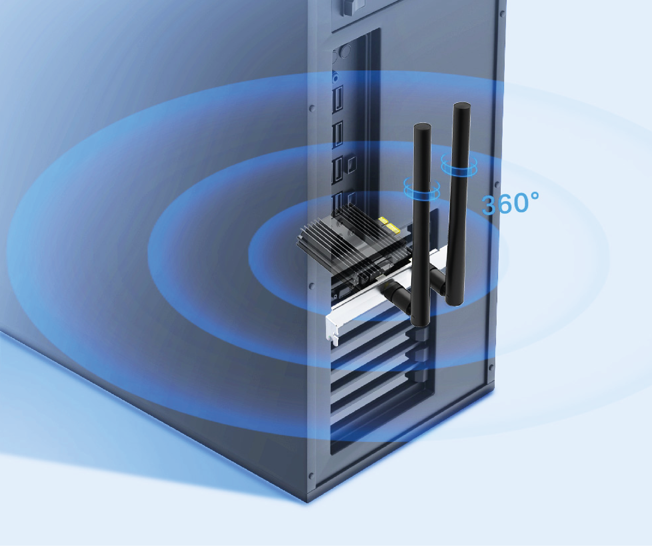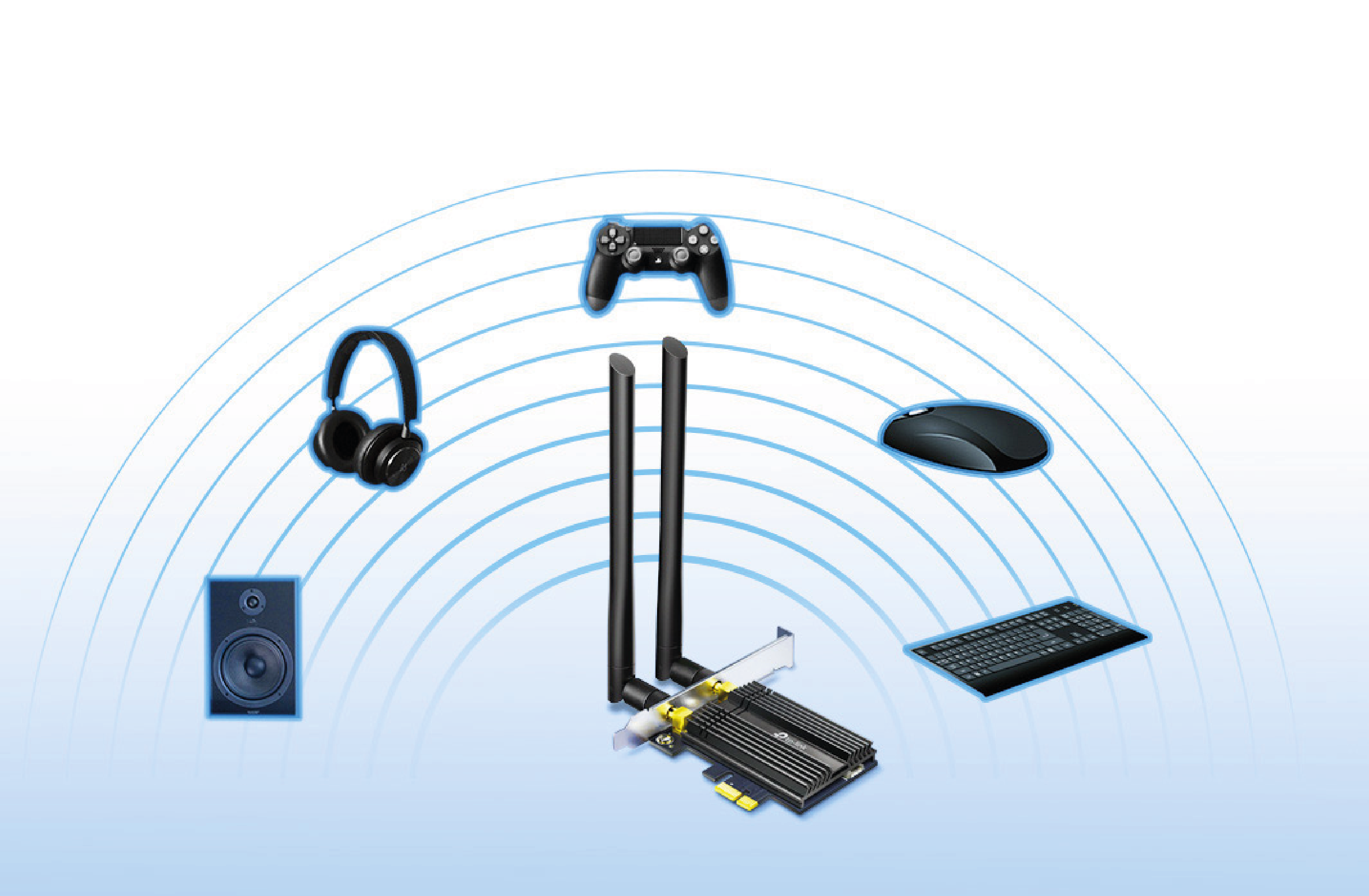 Modulacja 1024-QAM i kanał o szerokości 160 MHz dbają o stały dostęp do niezawodnej sieci Wi-Fi, tak aby wykorzystać pełen potencjał routera Wi-Fi 6.‡ Osiągając prędkości 3 razy szybsze niż w standardzie Wi-Fi 5, urządzenie z łatwością udźwignie nawet wymagające dużej przepustowości symulacje VR.§ Podłącz kartę sieciową do komputera i pozwól, aby pochłonął Cię świat VRu.